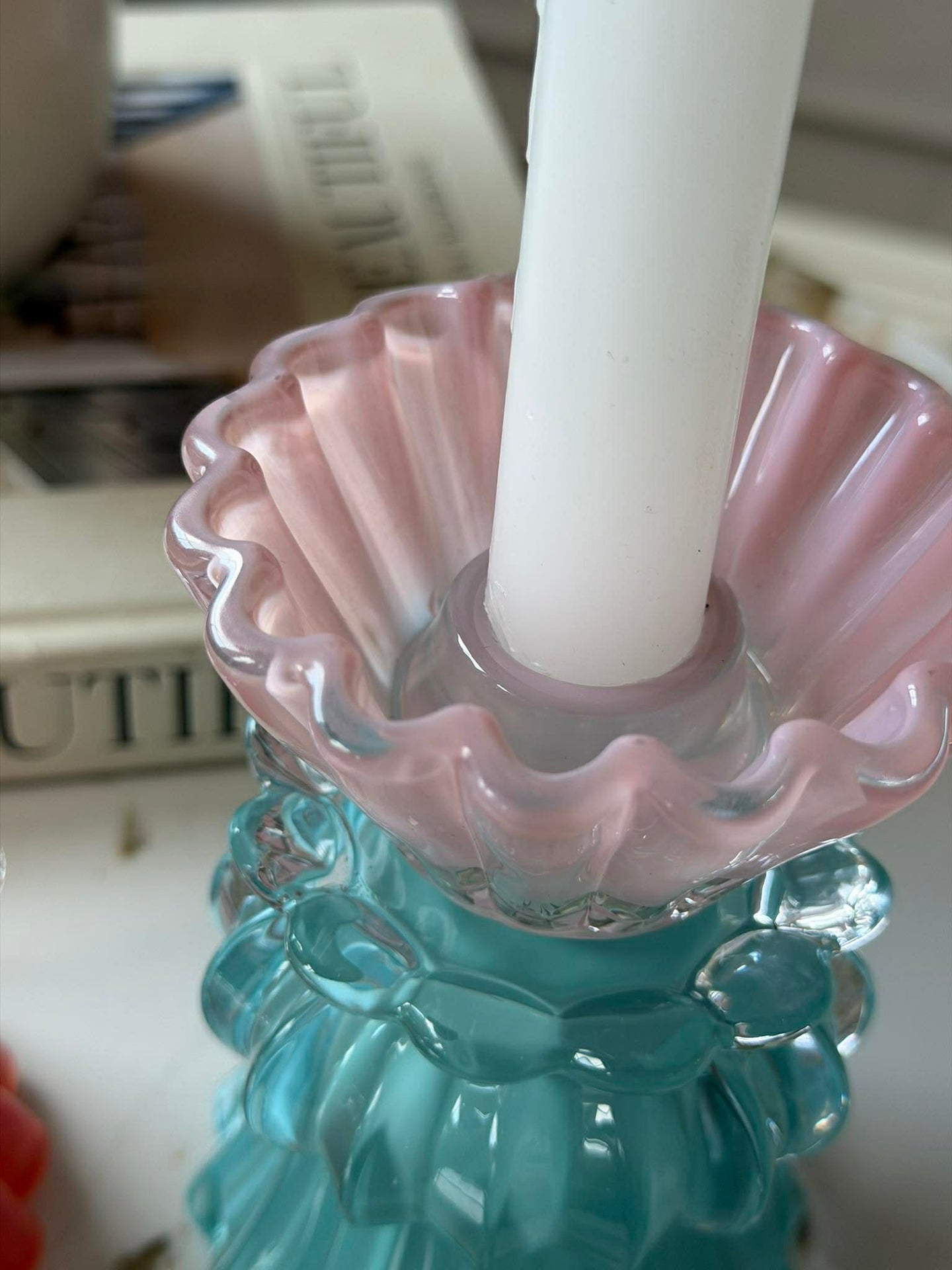 Ljusstaken är utförd i glas med ett flerfärgat uttryck som ger ett levande spel, oavsett om den står ensam eller tillsammans med andra ljusstakar.