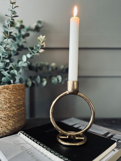 Skapa en varm och mysig atmosfär i ditt hem med denna vackra ljusstake. Låt dess rustika guldfinish sprida ljus och glädje på mörka kvällar. Ge ditt hem en touch av elegans och stil med denna stilfulla ljusstake - ett perfekt sätt att skapa stämning i ditt rum.