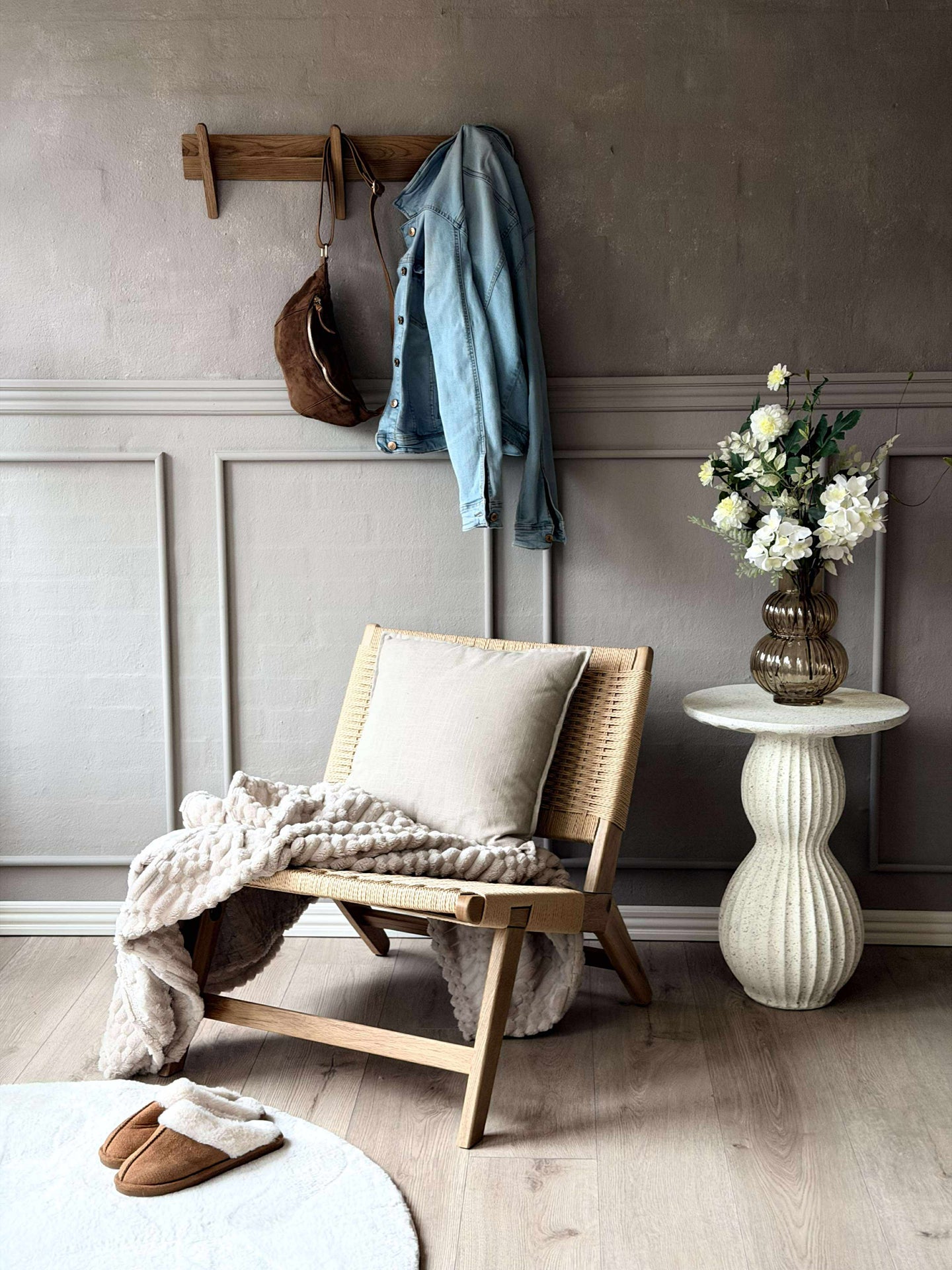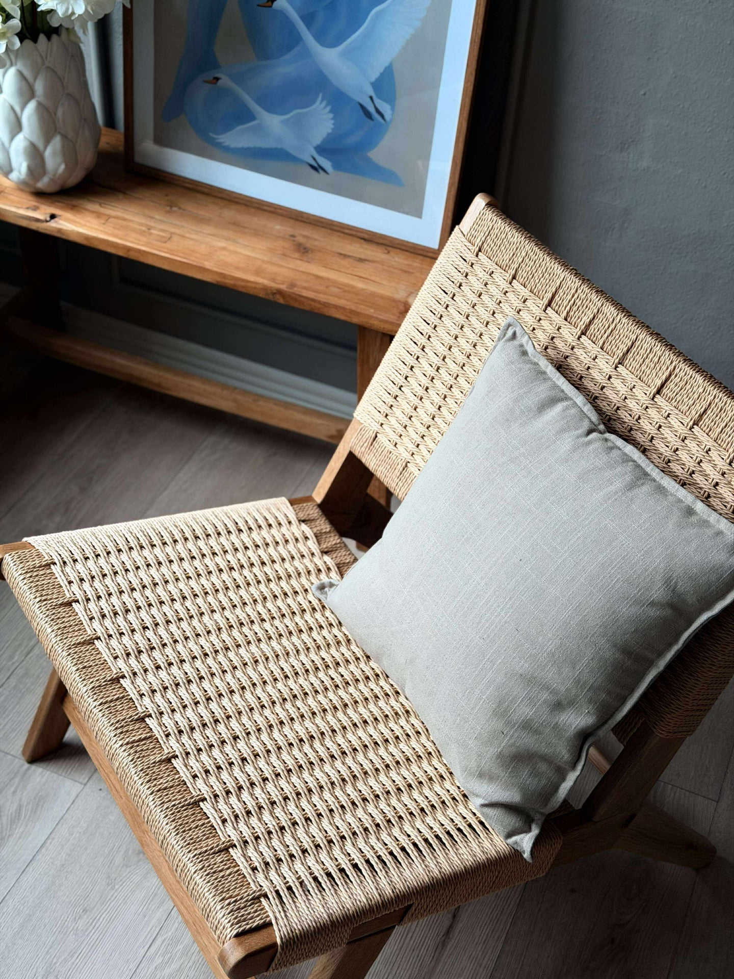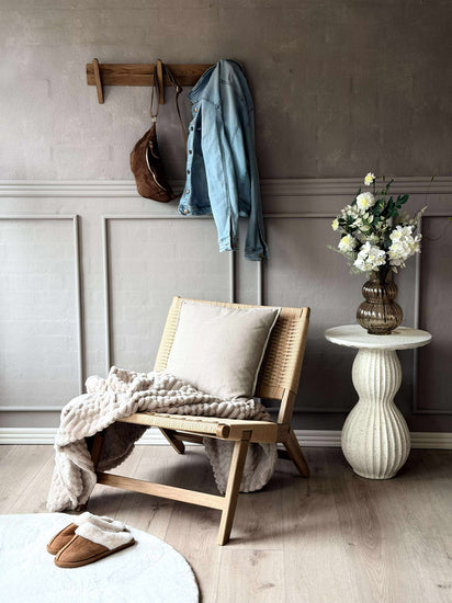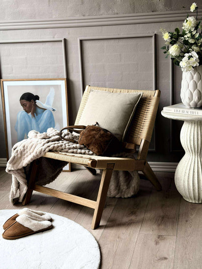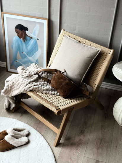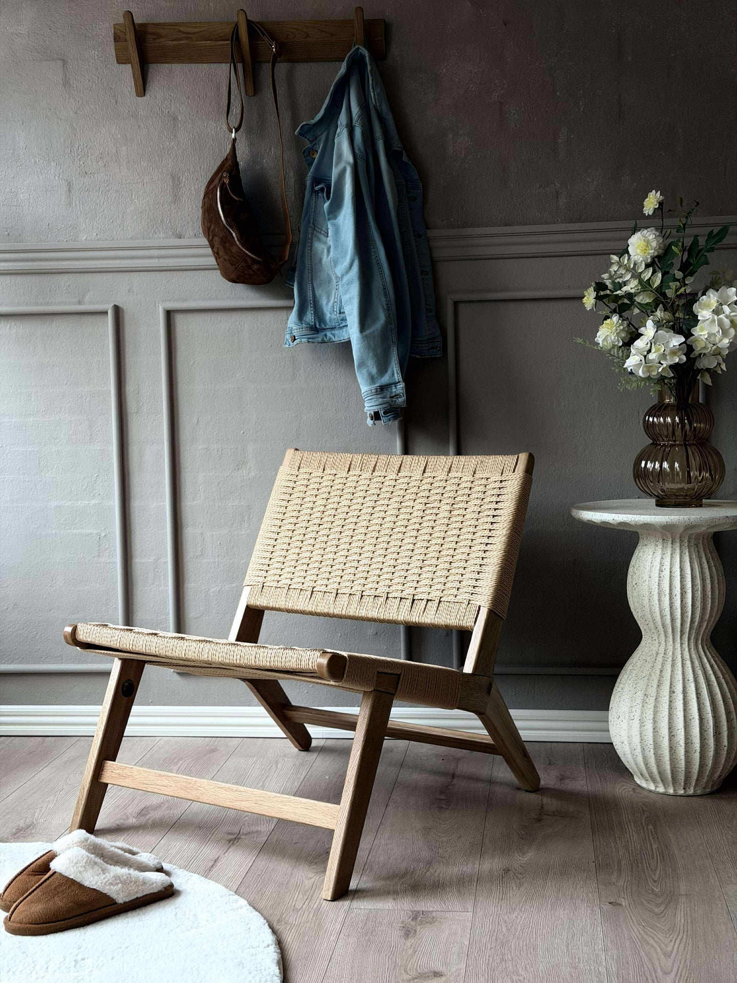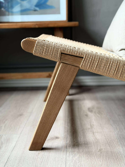 Stolen är utförd i massiv ek och har pappersflätat säte och rygg. Kombinationen av trä och flätning tillför en stilsäker, modern touch och understryker den nordiska designen.