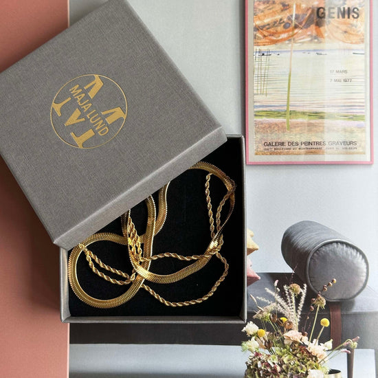 Guldhalsbandet är tillverkat av rostfritt stål och förgyllt med 18K guld, vilket ger en kombination av hållbarhet och lyx. Det rostfria stålet säkerställer att halsbandet är motståndskraftigt mot slitage och korrosion, medan 18K guldpläteringen tillför en strålande glans. Denna sammansättning gör halsbandet till ett långvarigt och stilfullt tillbehör som behåller sin skönhet över tid.