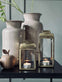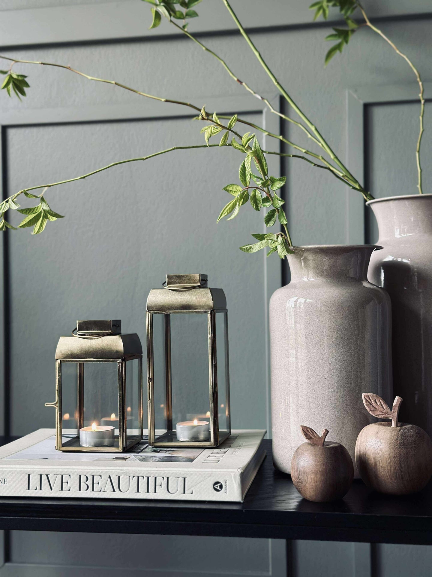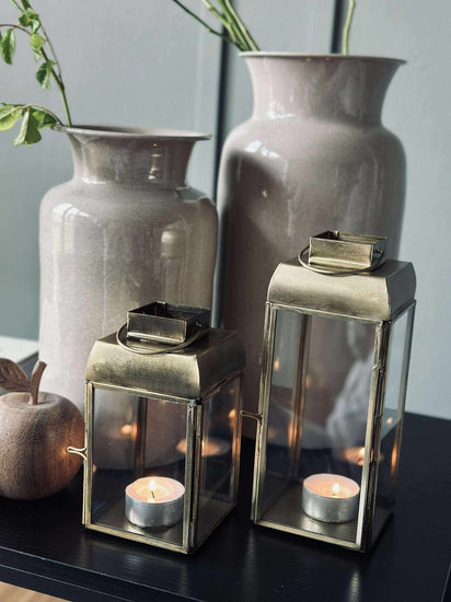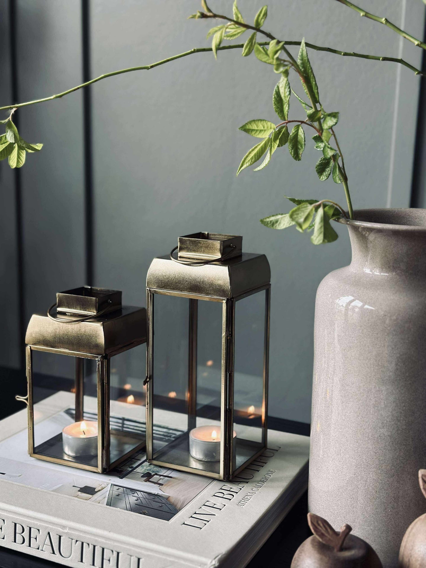 Metalllyktan erbjuder flexibilitet med sina två storlekar: liten och stor. Den mindre storleken passar utmärkt för mysiga hörn eller som en del av ett större dekorativt arrangemang. Den större varianten fungerar väl som ett centralt blickfång, vilket skapar en varm atmosfär i större utrymmen. Valfriheten i storlek gör det enkelt att anpassa lyktan efter olika interiörstilar och behov.