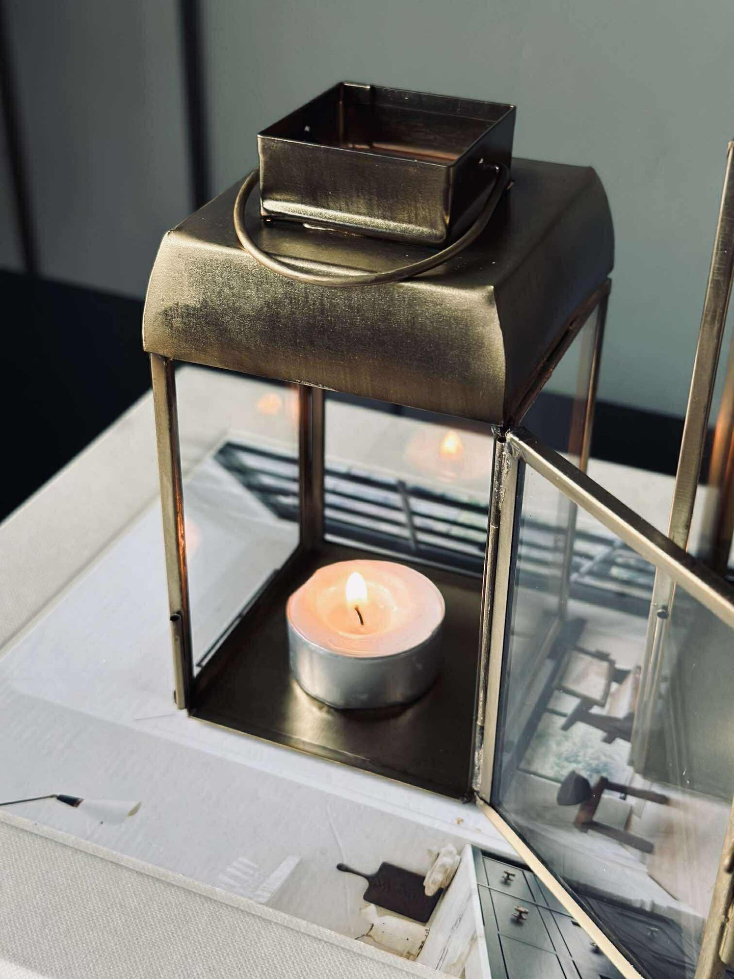 - Liten metalllykta med måtten 8 x 8 x 14 cm
