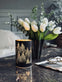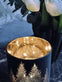 Ljuslyktan är gjord i metall och har en mönstrad design i svart/guld som framhäver ljuset när den är tänd.