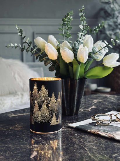 Dekorativ ljuslykta svart guld med LED-ljus i svart och guld. Ljuslyktan är utförd i metall och har ett mönster som ger ett stämningsfullt ljus när mörkret faller på. Den passar för inomhusbruk och fungerar som en liten detalj i inredningen.