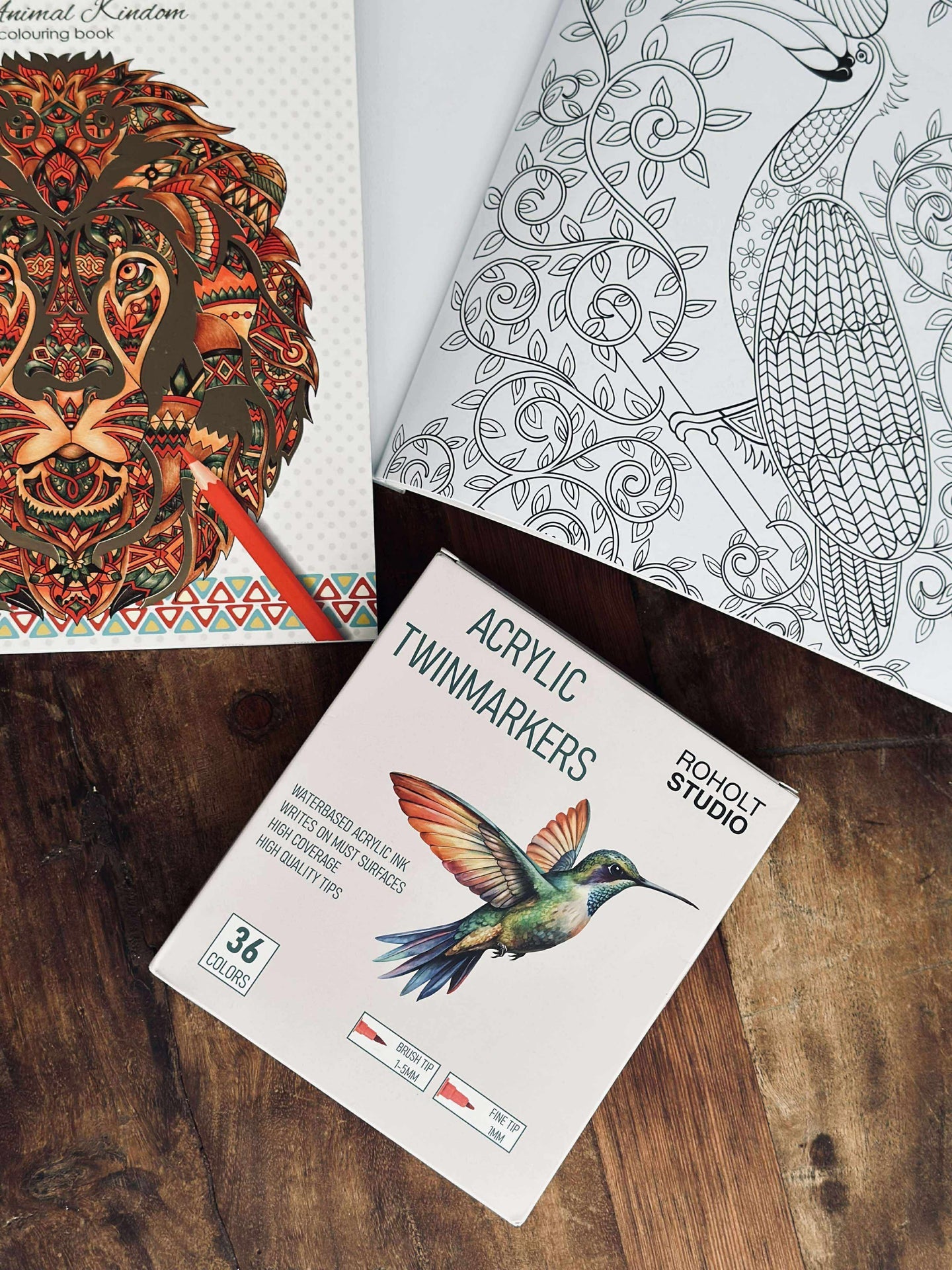 Djurmålarbokens papper erbjuder en solid och slät yta som är anpassad för färgpennor, tuschpennor och fina liners. Detta underlättar jämna och detaljerade färgläggningar utan risk för att pennorna fastnar eller blöder igenom. Den släta ytan gör det möjligt att skapa skarpa linjer och nyanser, vilket bidrar till en mer tillfredsställande och kreativ färgläggningsupplevelse.