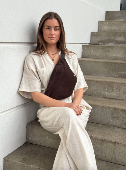Denna midjeväska är tillverkad av 100 % äkta mocka, vilket ger en mjuk och lyxig känsla vid beröring. Materialet åldras vackert över tid och utvecklar en karaktäristisk patina som bara blir bättre med användning. Äkta mocka är dessutom slitstarkt och anpassar sig väl till olika stilar, vilket gör väskan till ett mångsidigt tillbehör i din garderob.