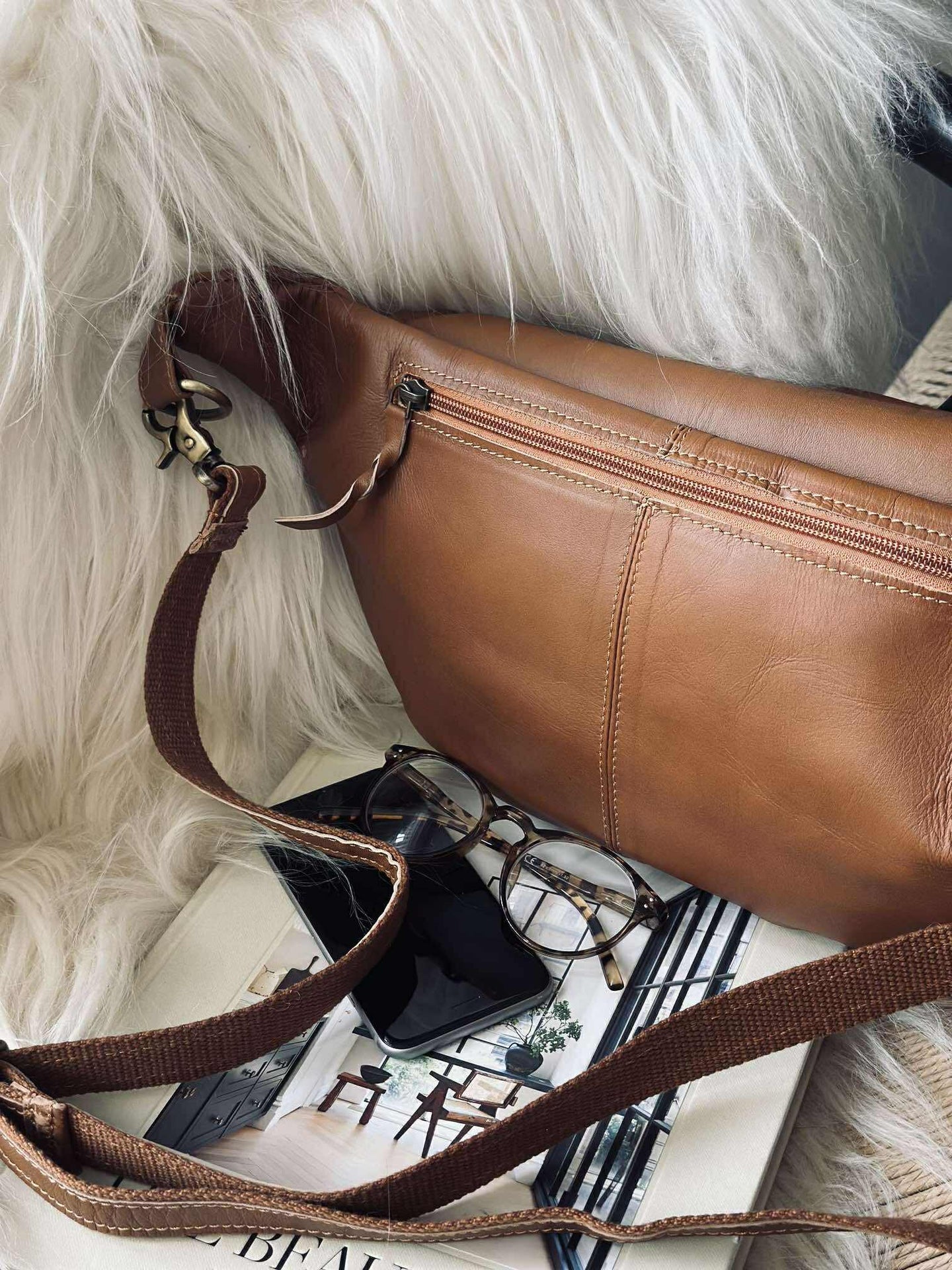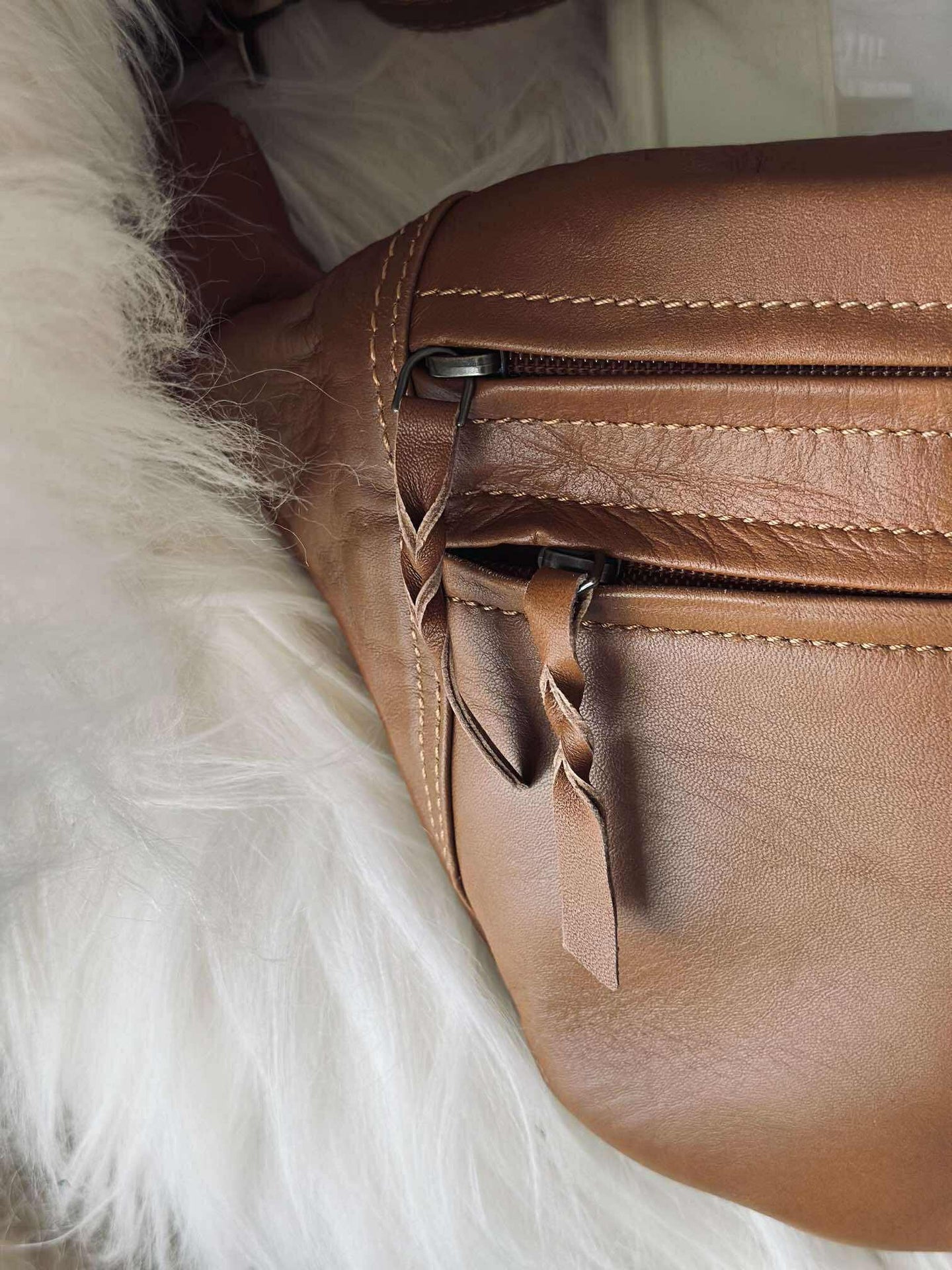 Midjeväskan är tillverkad av 100 % äkta lammskinn, vilket ger en mjuk och behaglig känsla vid beröring. Materialet är både slitstarkt och flexibelt, vilket gör att väskan anpassar sig efter dina behov och håller över tid. Lammskinnet ger också en naturlig glans och en tidlös estetik som kompletterar din personliga stil.