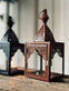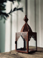 Denna minilykta i brun färg är en sann skönhet med sin orientaliska design. Den är utsmyckad med intrikata mönster och strukturer som ger en dekorativ touch till ditt hem. Lyktan har en kubisk form med glaspaneler och en topp formad som ett spetsigt tak, vilket skapar en unik och intressant silhuett.
