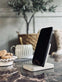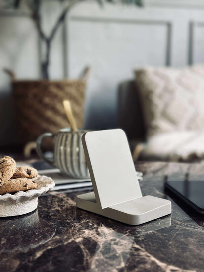 Mobilhållaren är tillverkad av målad betong, vilket ger en stabil och hållbar bas för din enhet. Betongens tyngd håller mobilen på plats och förhindrar oönskade rörelser. Dessutom ger den målade ytan en stilren och modern känsla som passar väl in i olika kontorsmiljöer. Materialvalet bidrar även till en lång livslängd, vilket gör mobilhållaren till ett pålitligt val för vardagligt bruk.