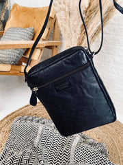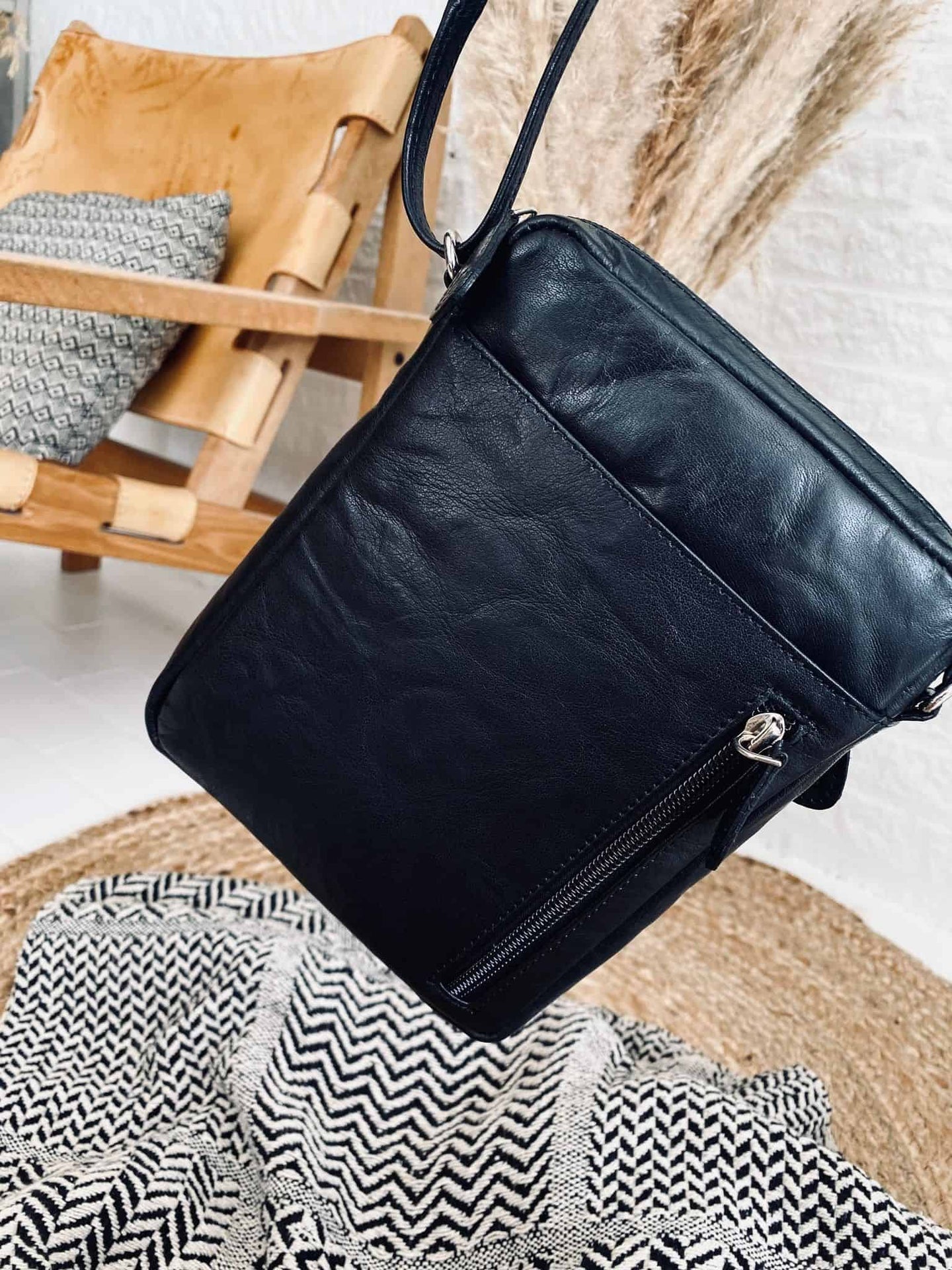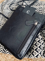 Vi pratar om en läcker mobilväska i svart skinn. Den är inte bara snygg, utan också praktisk med sin generösa storlek. Du kan enkelt bära med dig din mobil, solglasögon, pass, nycklar och solkräm. Detta är din perfekta följeslagare för vardagen.