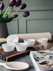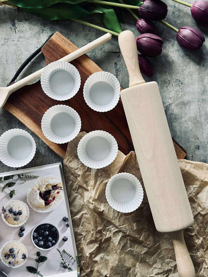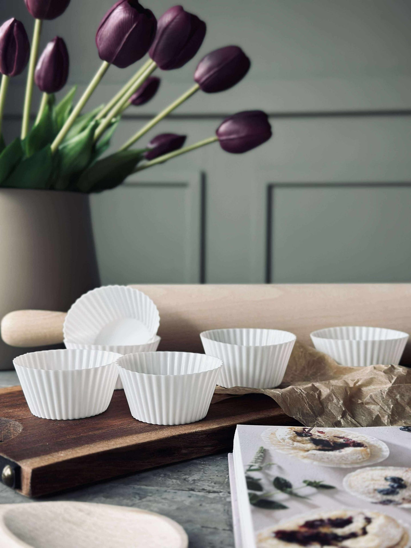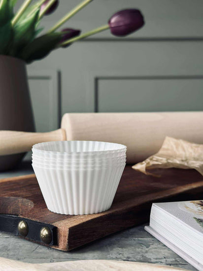 Dessa muffinsformar är tillverkade av silikon, vilket ger dem en flexibel och hållbar struktur. Silikonets naturliga egenskaper gör att formarna enkelt släpper ifrån sig bakverken utan att de fastnar, vilket underlättar både bakning och rengöring. Materialet tål höga temperaturer och är säkert att använda i både ugn och diskmaskin, vilket gör dem till ett praktiskt val i köket.