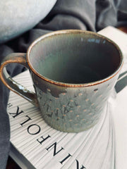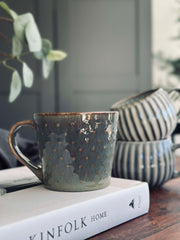 - Keramikmuggen har en färgkombination av grå, grön och brun med prickar