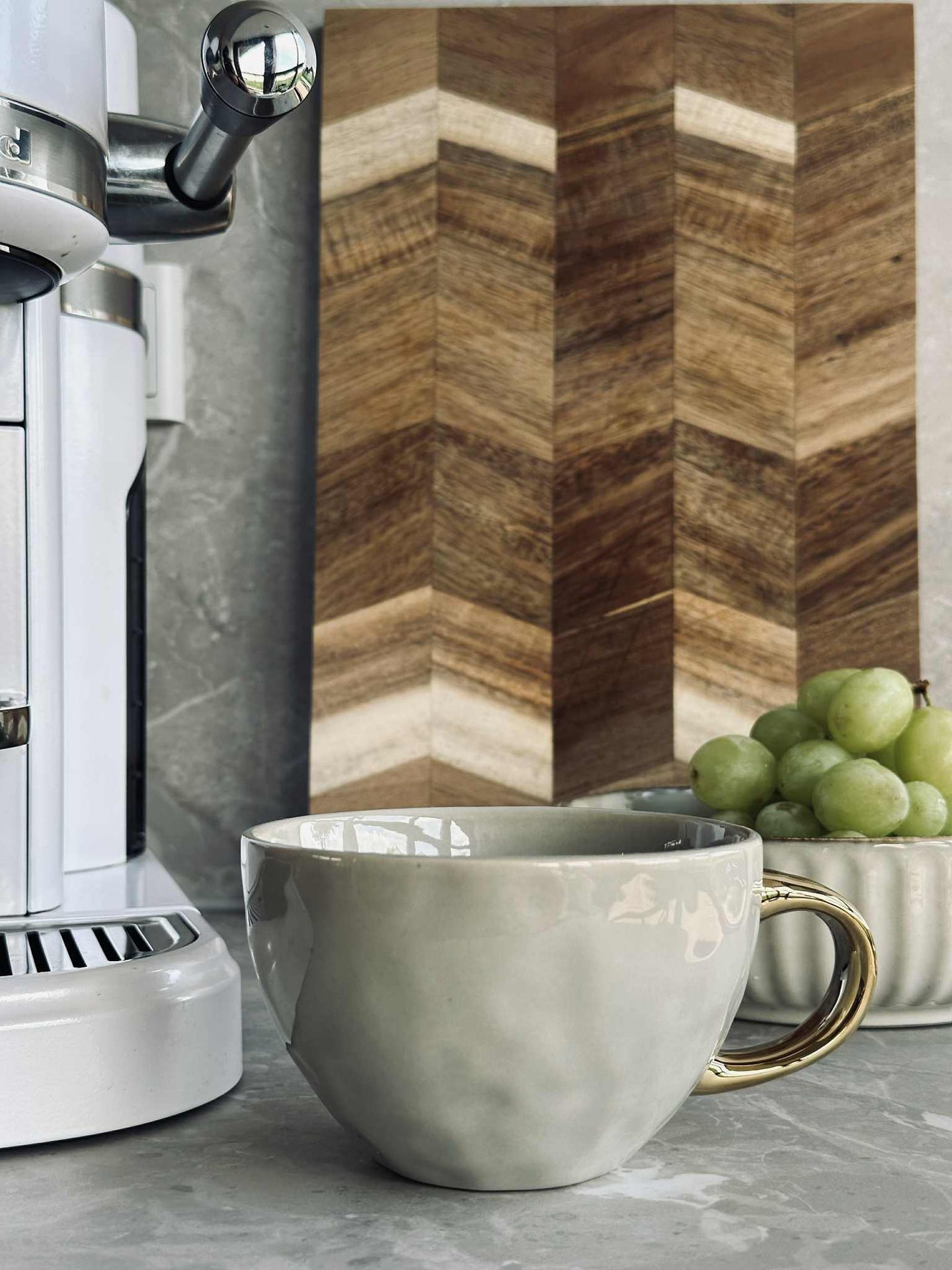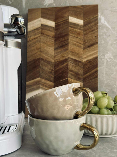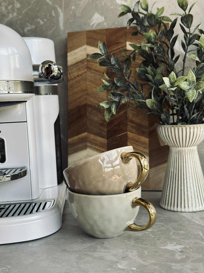 Den guldiga muggen är tillverkad av stengods, vilket ger en robust och hållbar känsla. Stengodsmaterialet bidrar till att behålla värmen längre, vilket gör den idealisk för både varma och kalla drycker. Dessutom ger den naturliga texturen en behaglig och stilren estetik som enkelt kan passa in i olika inredningsstilar. Den tåliga ytan är också lätt att rengöra, vilket underlättar vardagsanvändningen.