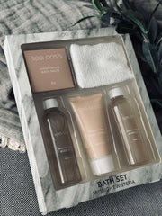 - Setet består av fem delar: duschkräm, kroppslotion, bubbelbad, badsalt och ansiktsduk