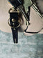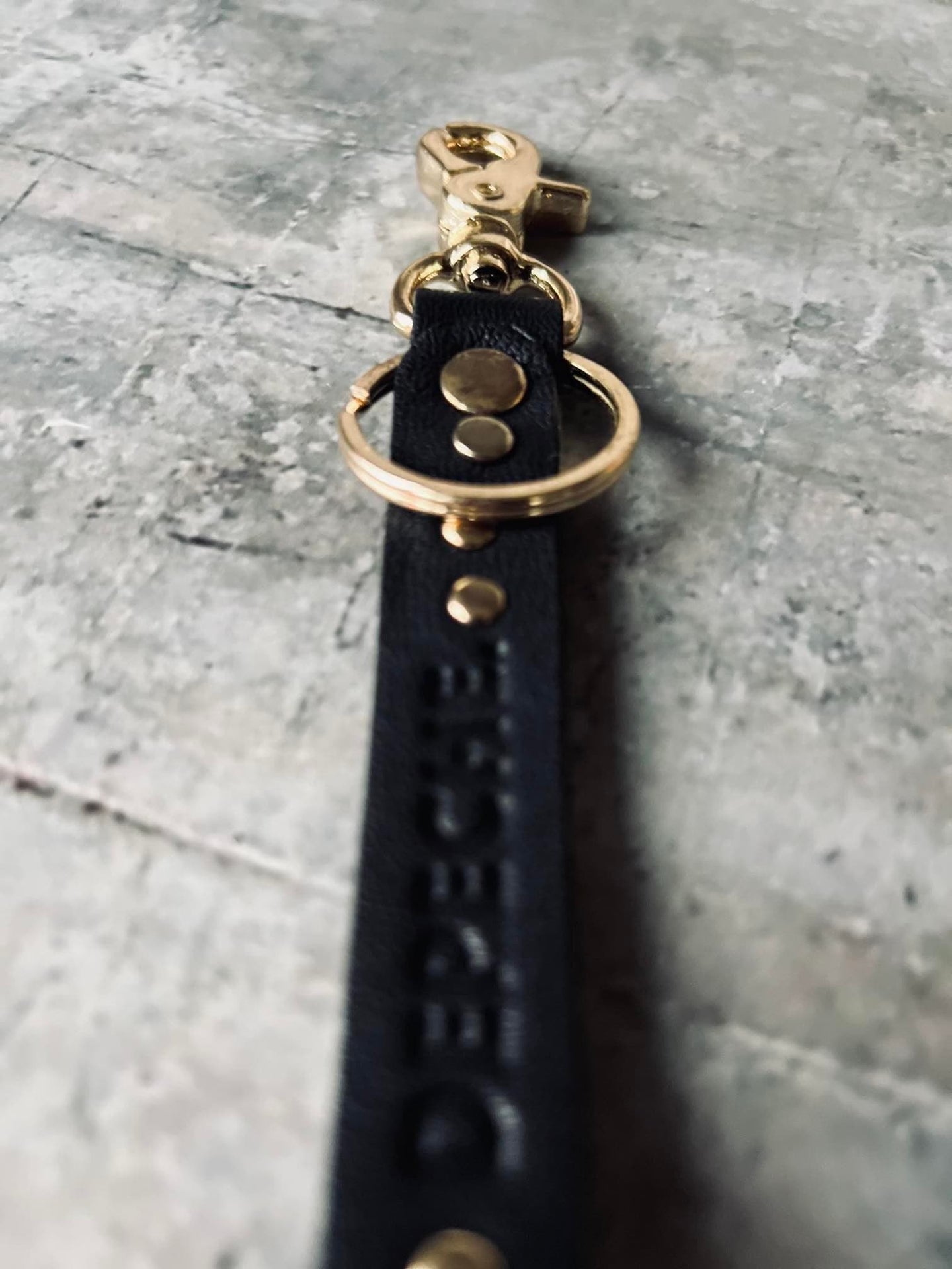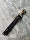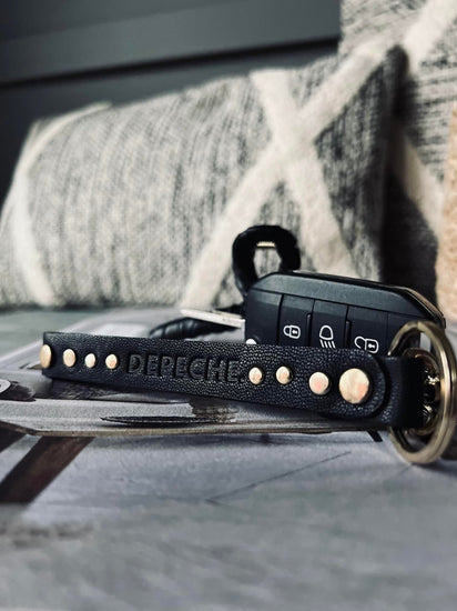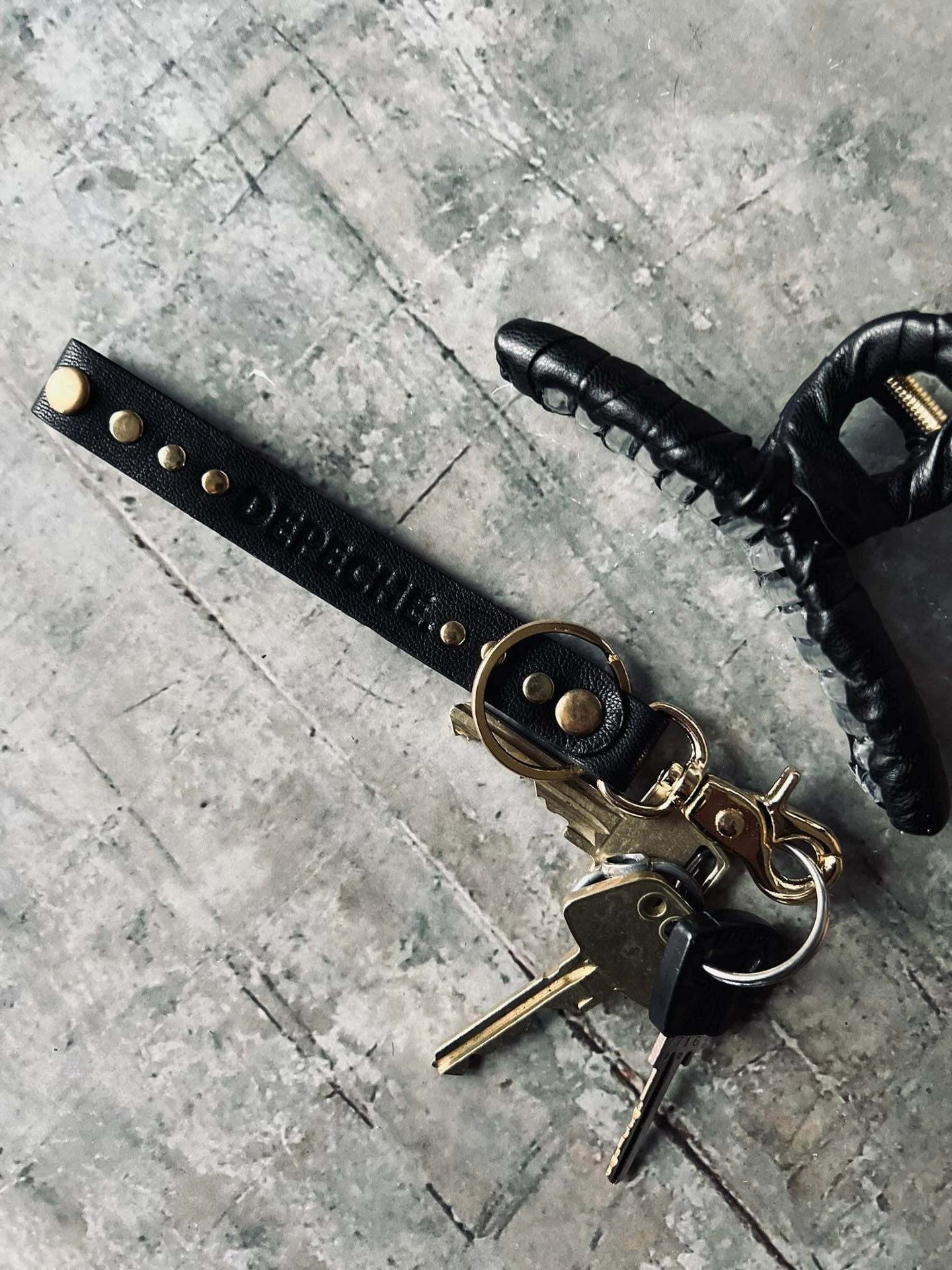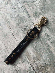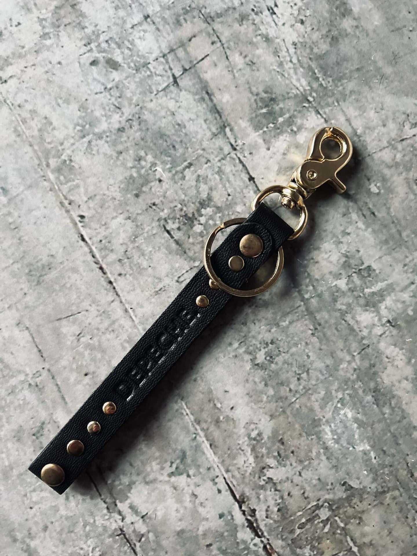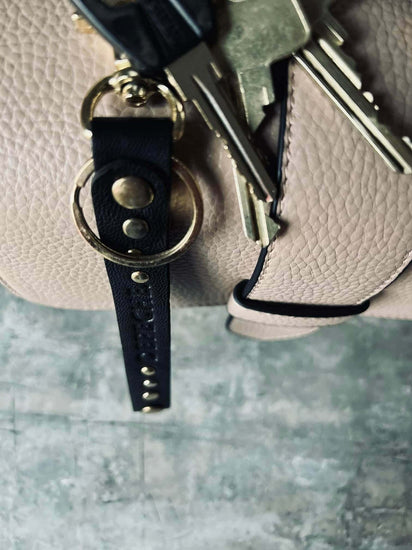 Detta är en nyckelring i svart läder prydd med metallnitar och prägling. Dess färgkombination är klassisk och dess design är robust. Nyckelringen har ett enkelt men stilfullt utseende som kan tilltala de som värdesätter kvalitet och diskret elegans i vardagstillbehör.