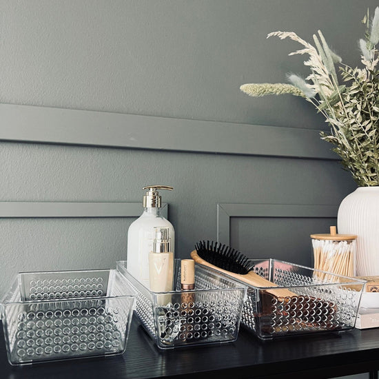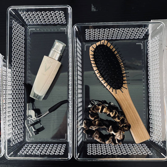 Vår makeupförvaring är tillverkad av högkvalitativ akryl, vilket ger en robust och hållbar produkt som tål daglig användning. Akrylens transparenta natur gör det enkelt att identifiera och komma åt dina skönhetsprodukter snabbt och effektivt. Dessutom ger akrylets glansiga finish en sofistikerad touch till din badrumsinredning.