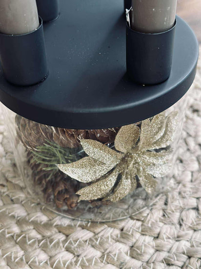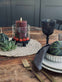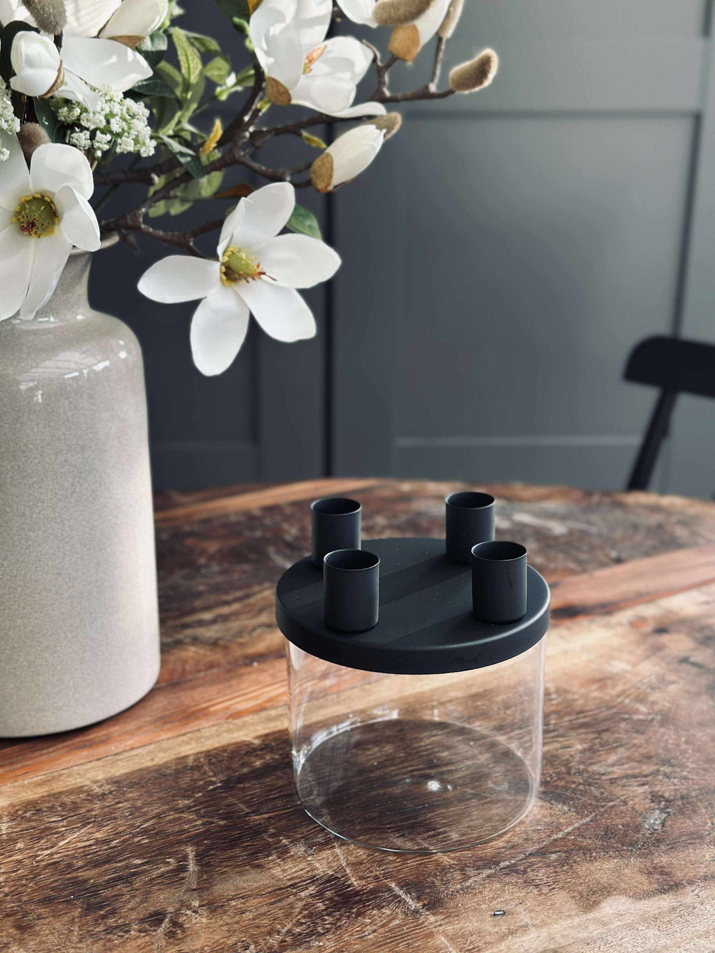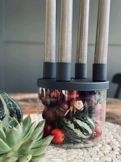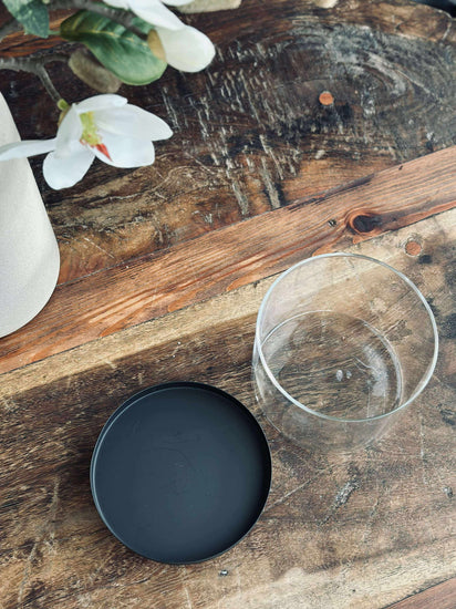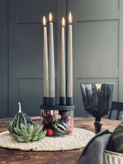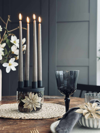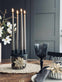 Ljusstaken är tillverkad i glas och hålls i svart för ett rent och minimalistiskt utseende. Det klara glaset ger ett lätt och transparent uttryck, medan den svarta färgen samlar helheten och gör den enkel att kombinera med både ljusa och mörka nyanser.