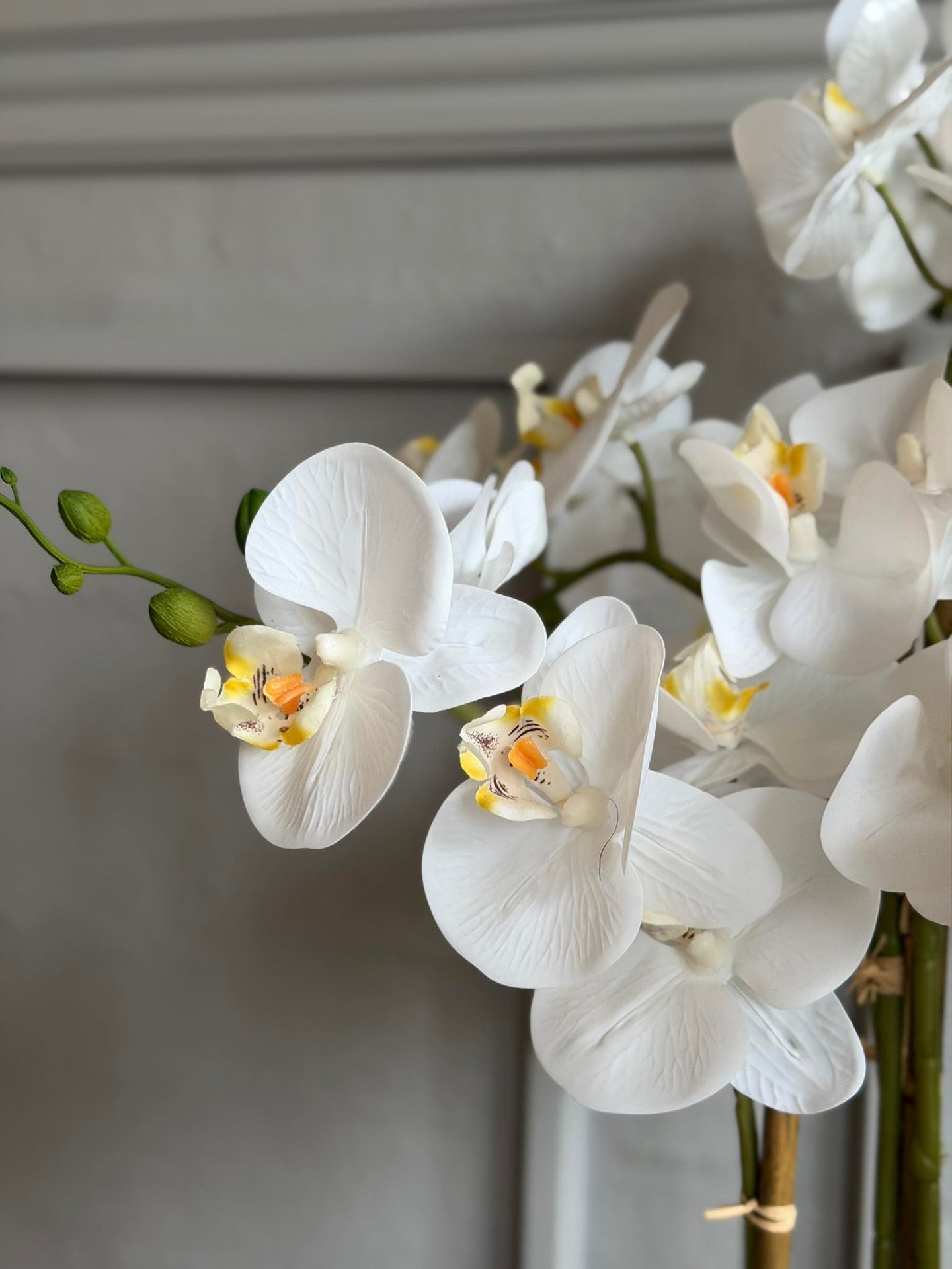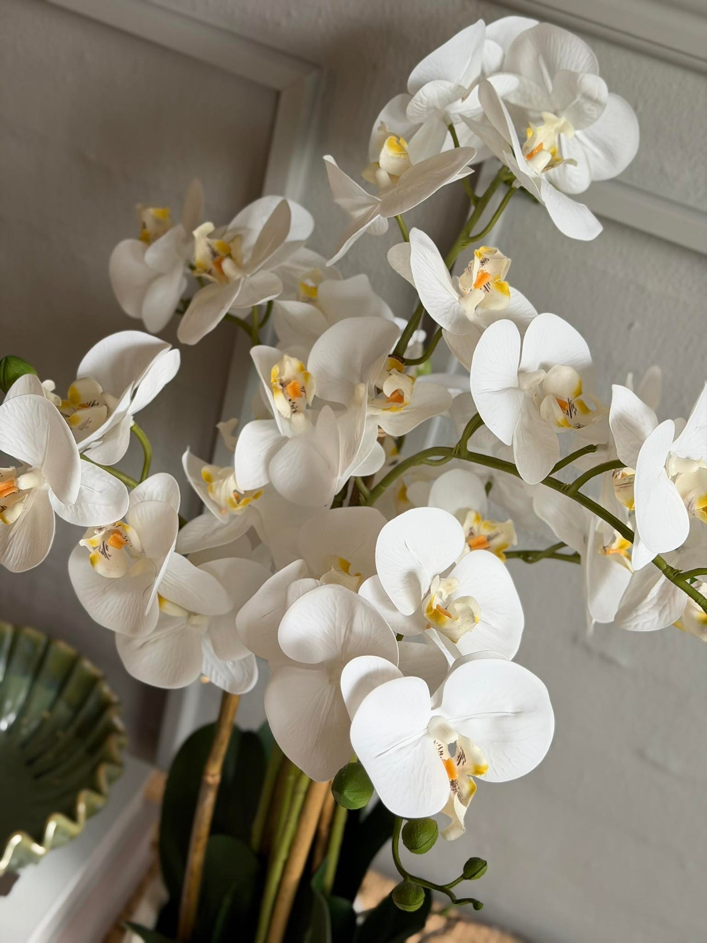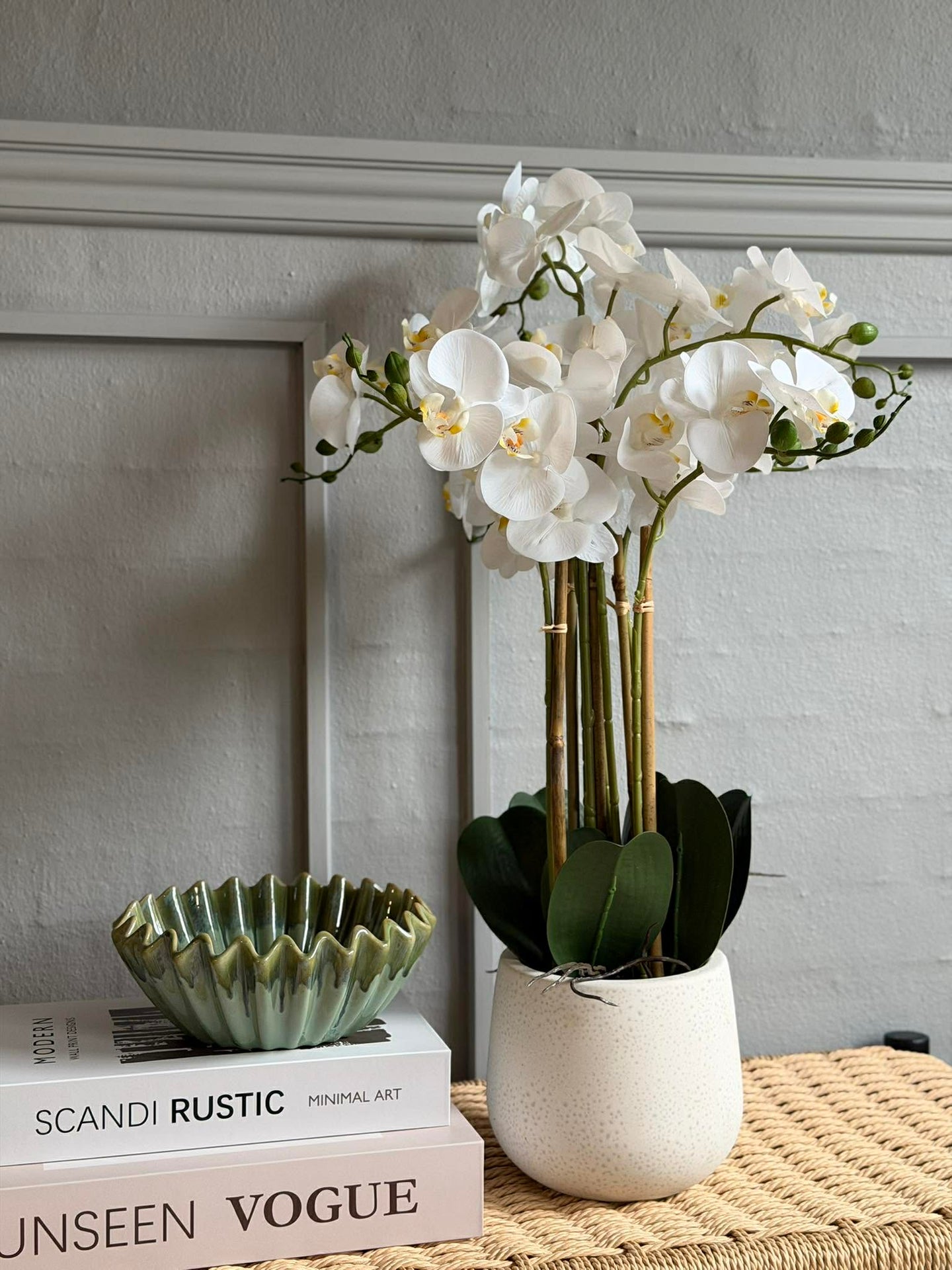 Orkidé i kruka 65 cm - vit är en naturtrogen konstgjord orkidé som tillför ett enkelt och lugnt uttryck till inredningen. Den vita färgen gör den lätt att kombinera med neutrala färgscheman, och den levereras med kruka.