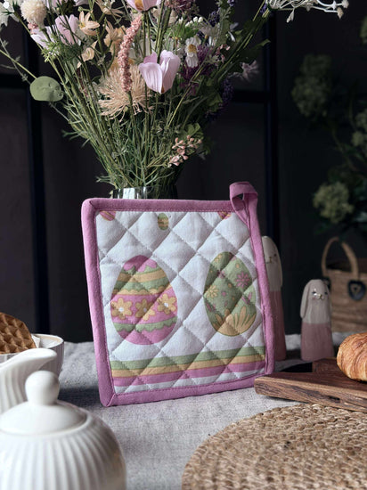 Grytlapp Påsk är en dekorativ och praktisk grytlapp med påskmönster i en rosaton. Den passar bra när du vill tillföra en säsongsskänsla till köket och bordsdukningen utan att kompromissa med funktionaliteten.