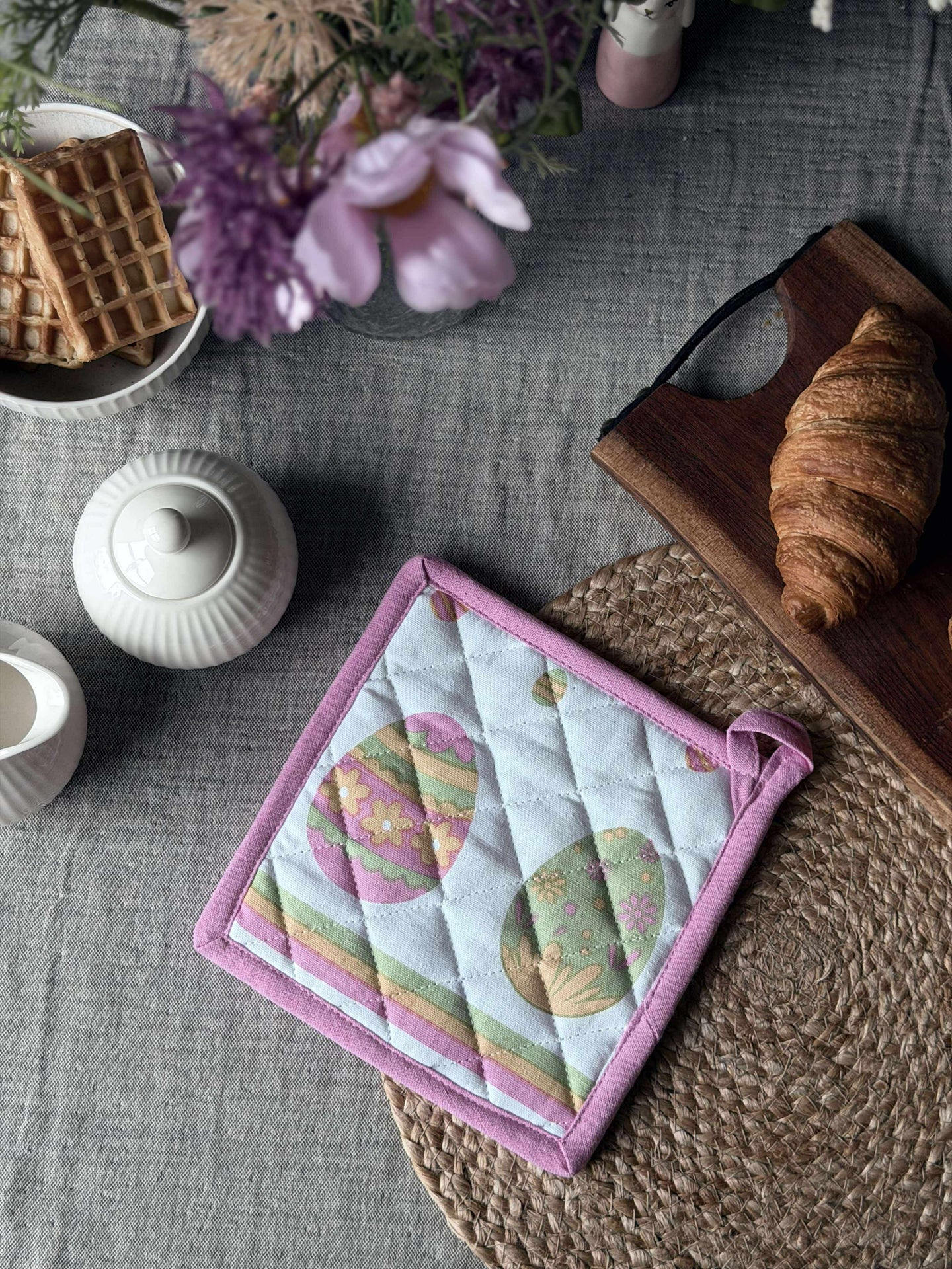 Grytlappen är lämplig för användning i kök och matplats när du hanterar varma ugnsformar och grytor och samtidigt vill ha ett påskinspirerat uttryck.