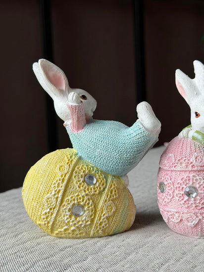 En söt liten påskhare med ägg, som ger ett fint, lekfullt uttryck i din påskdekoration. Figurerna säljs assorterade, så du får en av fyra olika varianter – utvald slumpmässigt.