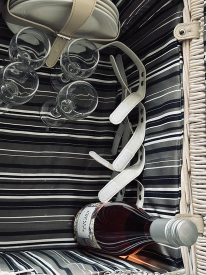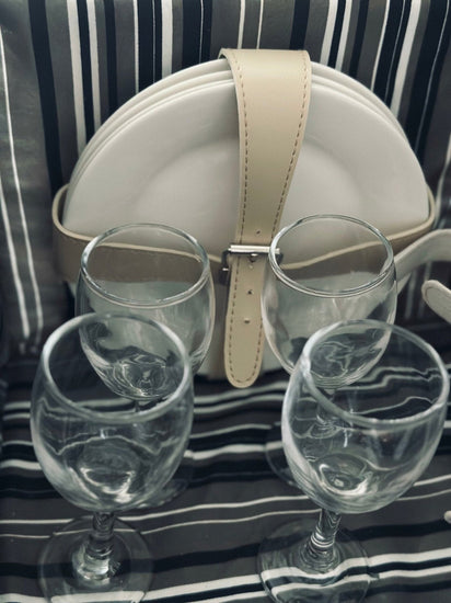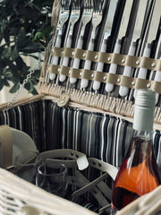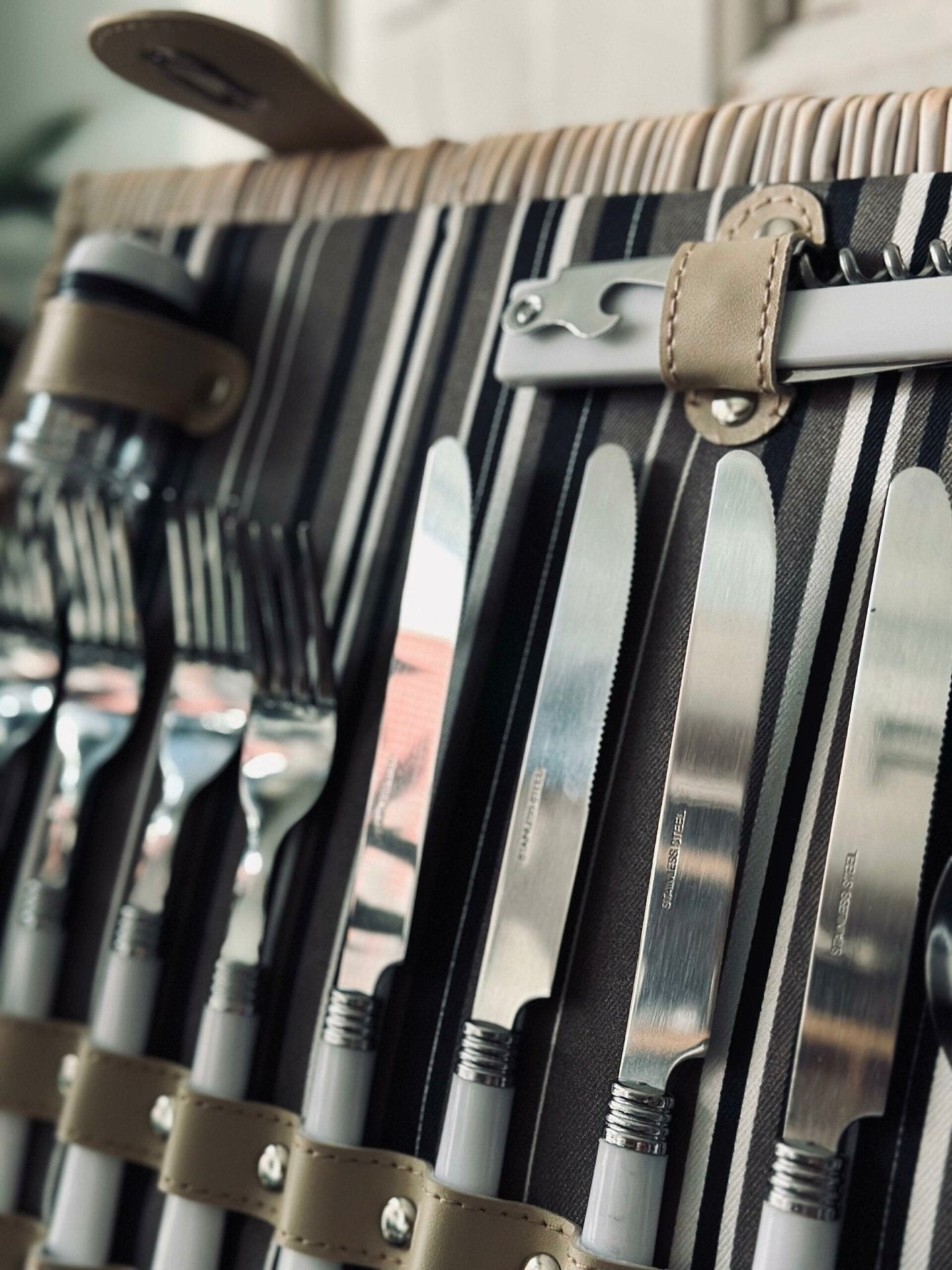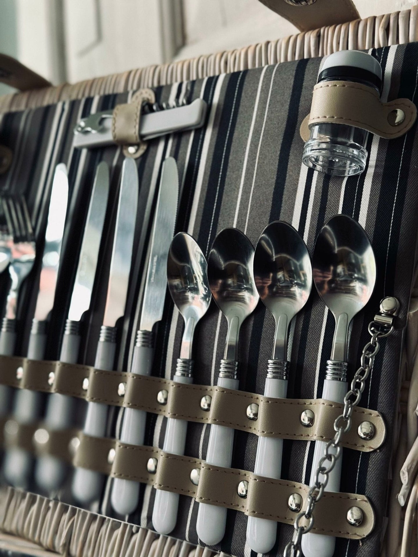 En av de mest framstående egenskaperna hos denna picknickkorg är att den innehåller service för fyra personer. Inkluderat i korgen finner du tallrikar, bestick och glas, alla säkrade med läderremmar. Detta innebär att du kan njuta av en picknick med familj eller vänner utan att behöva oroa dig för att packa separat porslin eller glas. Allt du behöver för en lyckad picknick finns redan i korgen, redo att användas när och var du vill.
