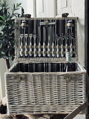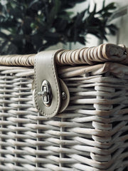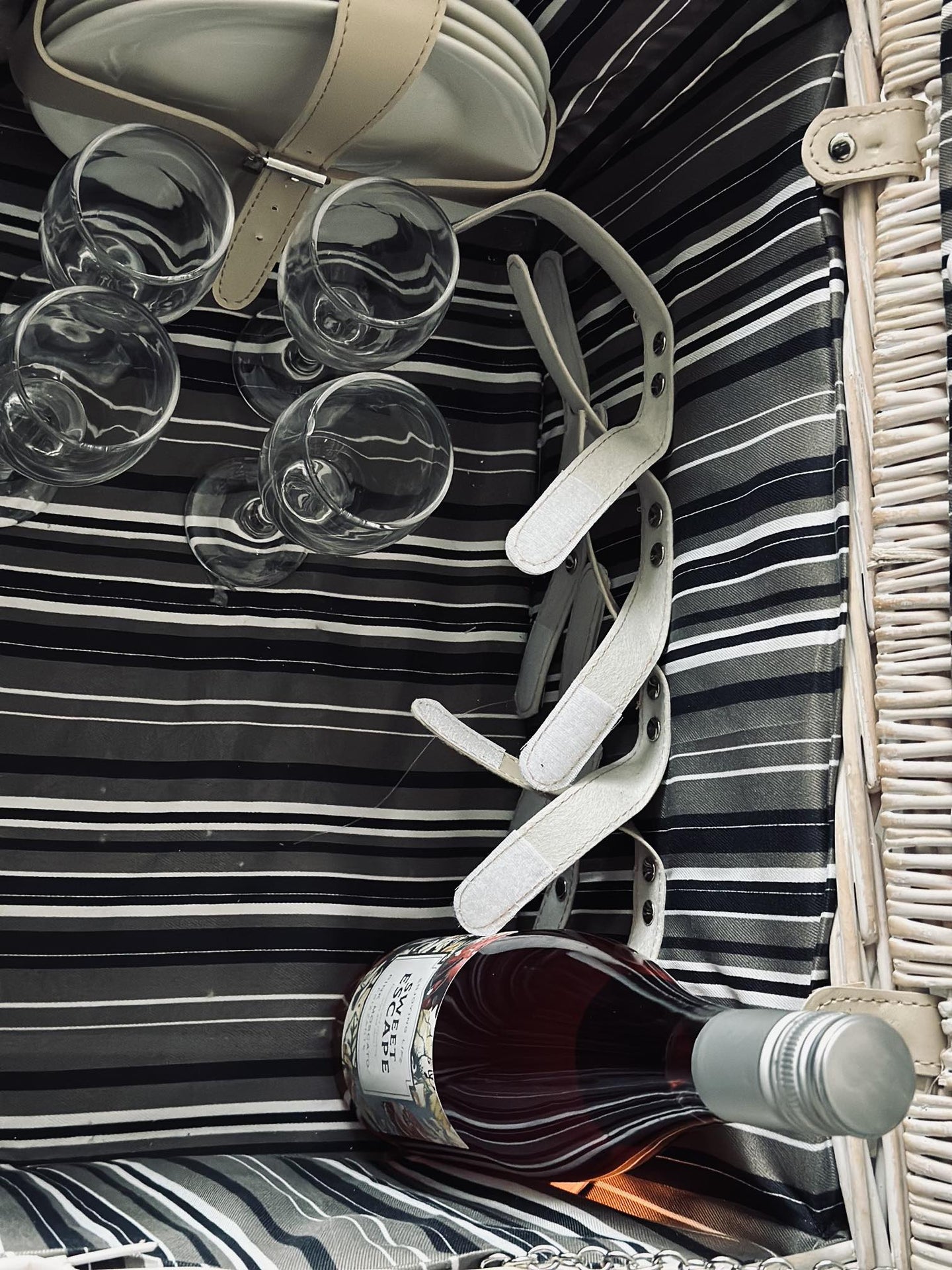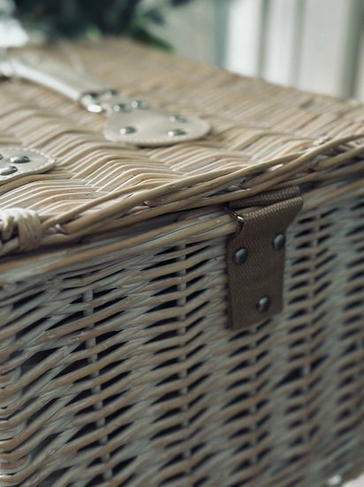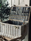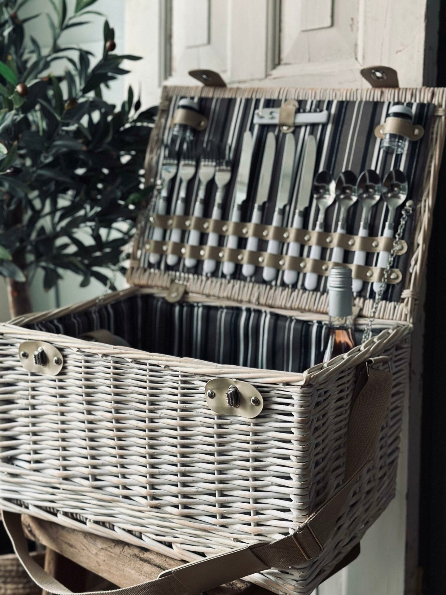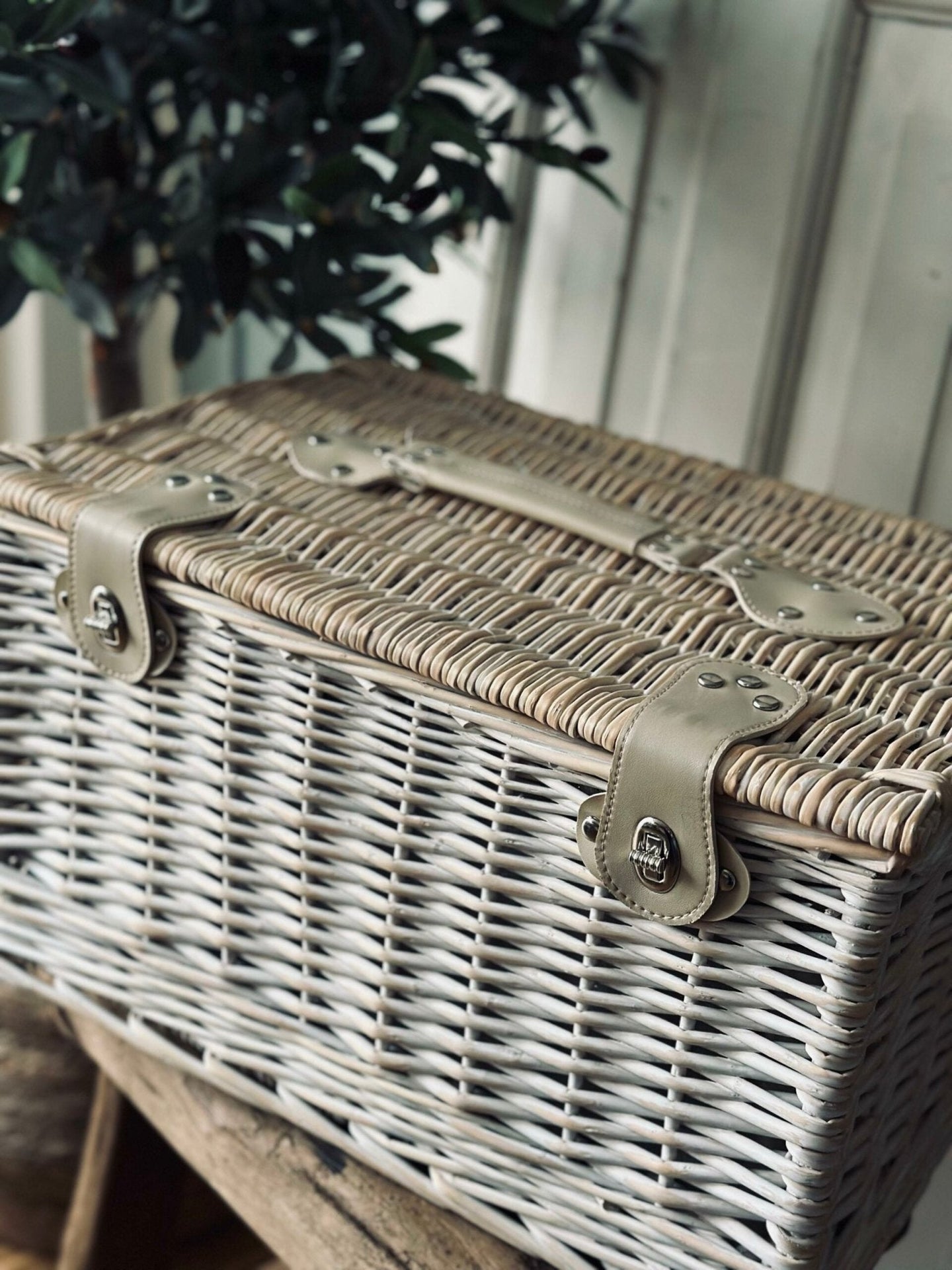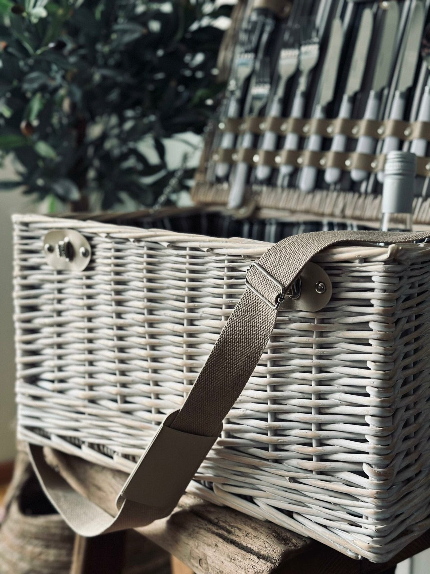 - Ljusgrå flätad picknickkorg med robusta läderdetaljer