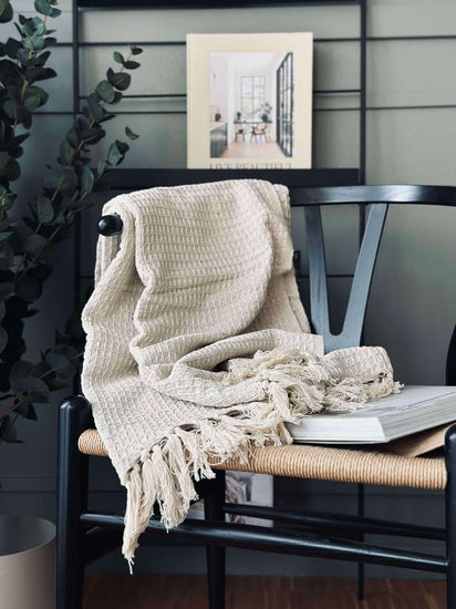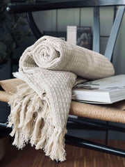 Den här pläden, tillverkad av äkta, våfflad bomull, erbjuder en mjuk och behaglig känsla mot huden. Materialets naturliga andningsförmåga hjälper till att reglera temperaturen, vilket gör den lämplig för alla säsonger. Dessutom ger den våfflade strukturen en subtil textur, vilket tillför en extra dimension till ditt hem och skapar en inbjudande atmosfär.