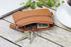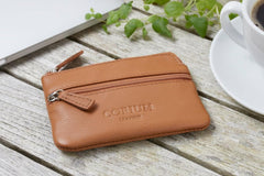 Denna pung med nyckelring är tillverkad av 100 % äkta skinn, vilket garanterar både hållbarhet och en naturlig känsla. Skinnets robusta karaktär ger ett slitstarkt skydd för dina föremål, samtidigt som det åldras vackert med tiden och utvecklar en distinkt patina. Den mjuka ytan ger också en behaglig känsla vid varje användning, vilket gör den till ett funktionellt och stilfullt tillägg till din vardag.