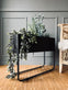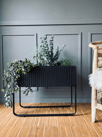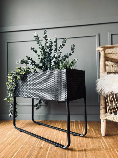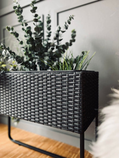 Denna svarta planteringslåda med ben är ett elegant tillskott till ditt hem. Det flätade designet ger en modern känsla, och den robusta metallramen säkerställer hållbarhet. Oavsett om du använder den för hemmabruk eller som ett dekorativt element kommer denna planteringslåda att förhöja din inredning.