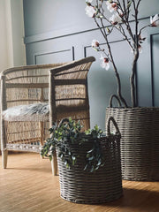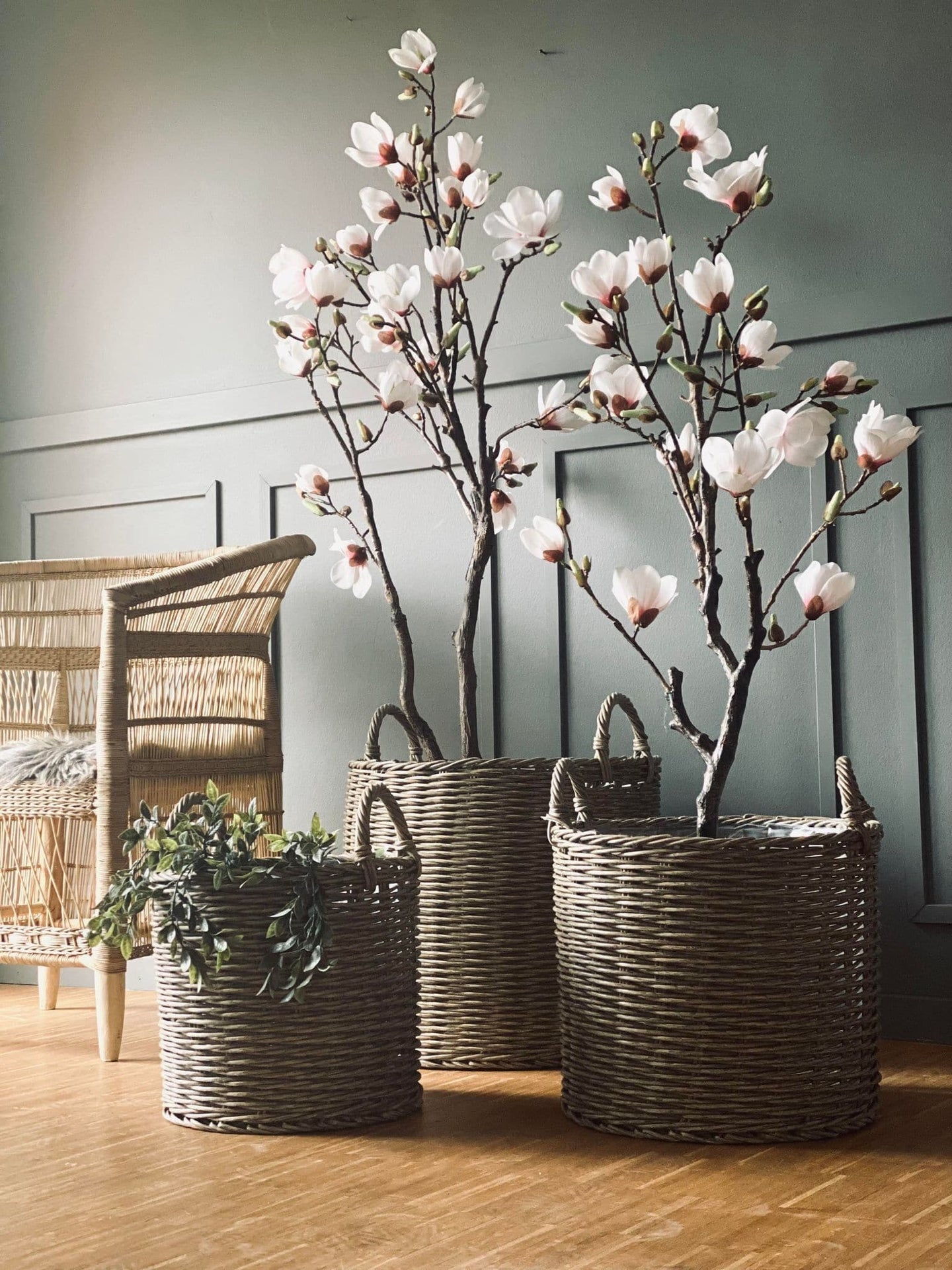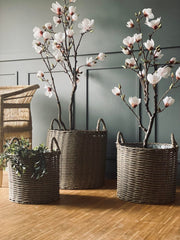 Vår uppsättning av tre plantkorgar i stor storlek erbjuder en perfekt lösning för dina växter. De är tillverkade av plast och rattan, ett hållbart material som håller i många år. Dessutom är korgarna fodrade med plast, vilket gör dem redo för plantering direkt.