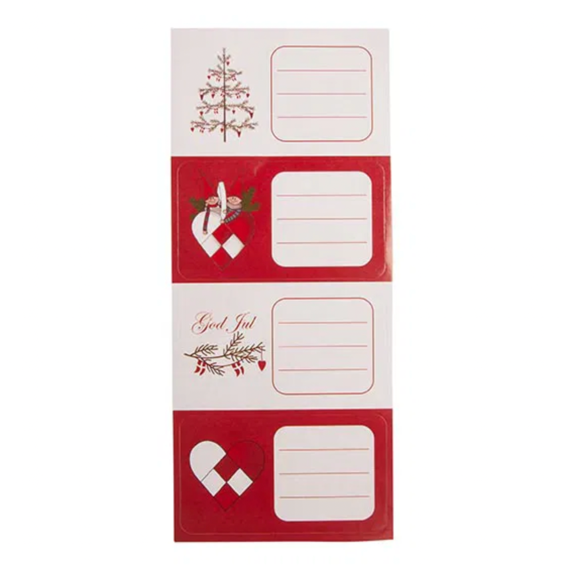 Presentetiketterna är tillverkade i papp med tryck som passar till julens presentinslagning.