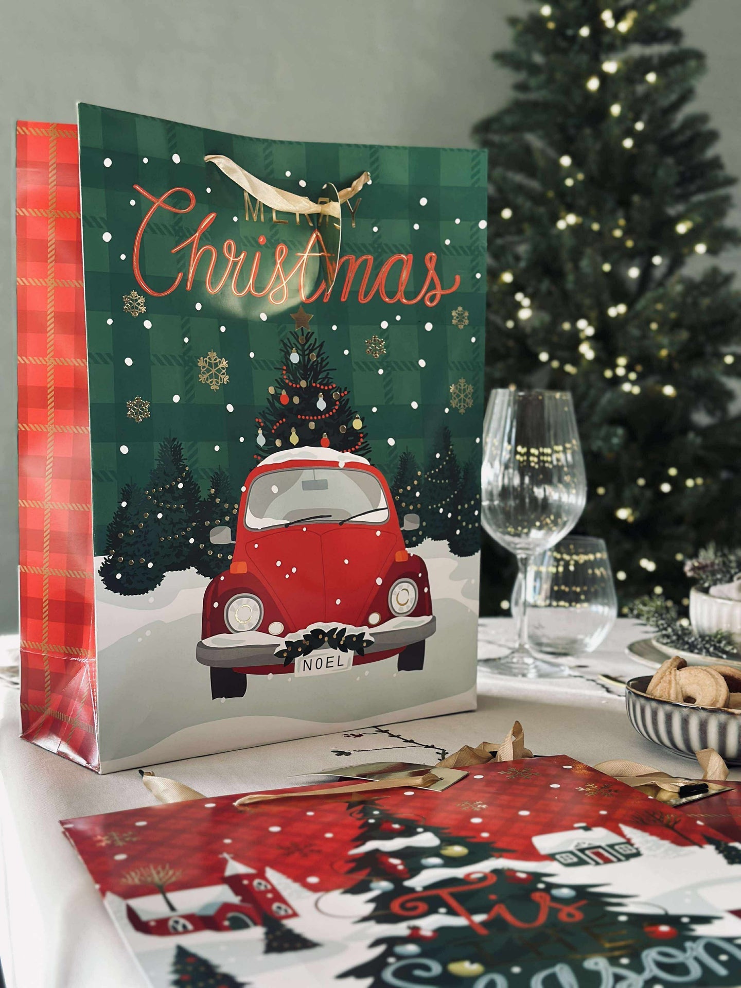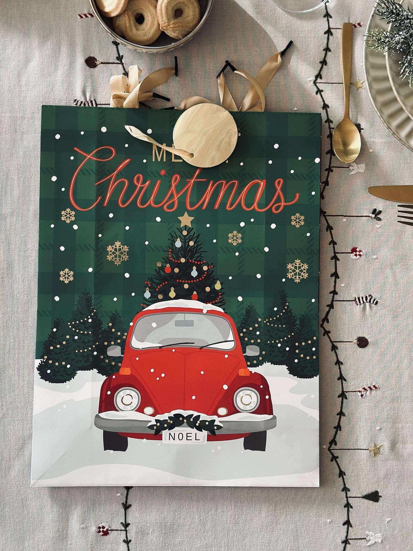 Materialet i presentpåsen är papper, vilket bidrar till en mer hållbar livsstil. Papper är biologiskt nedbrytbart och kan återvinnas, vilket minskar avfall och miljöpåverkan. Dessutom ger det en naturlig och varm känsla, vilket passar utmärkt för julens gåvor. Genom att välja en presentpåse av papper gör du ett medvetet val för miljön utan att kompromissa med estetiken.