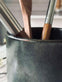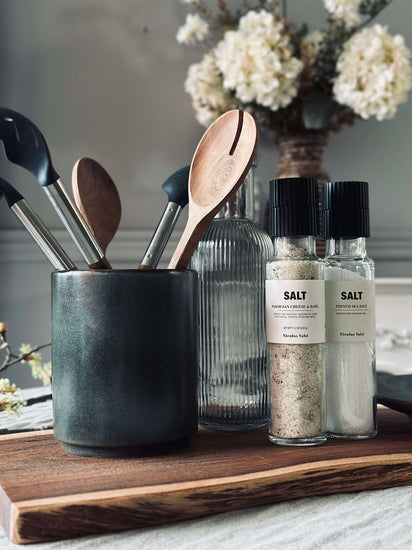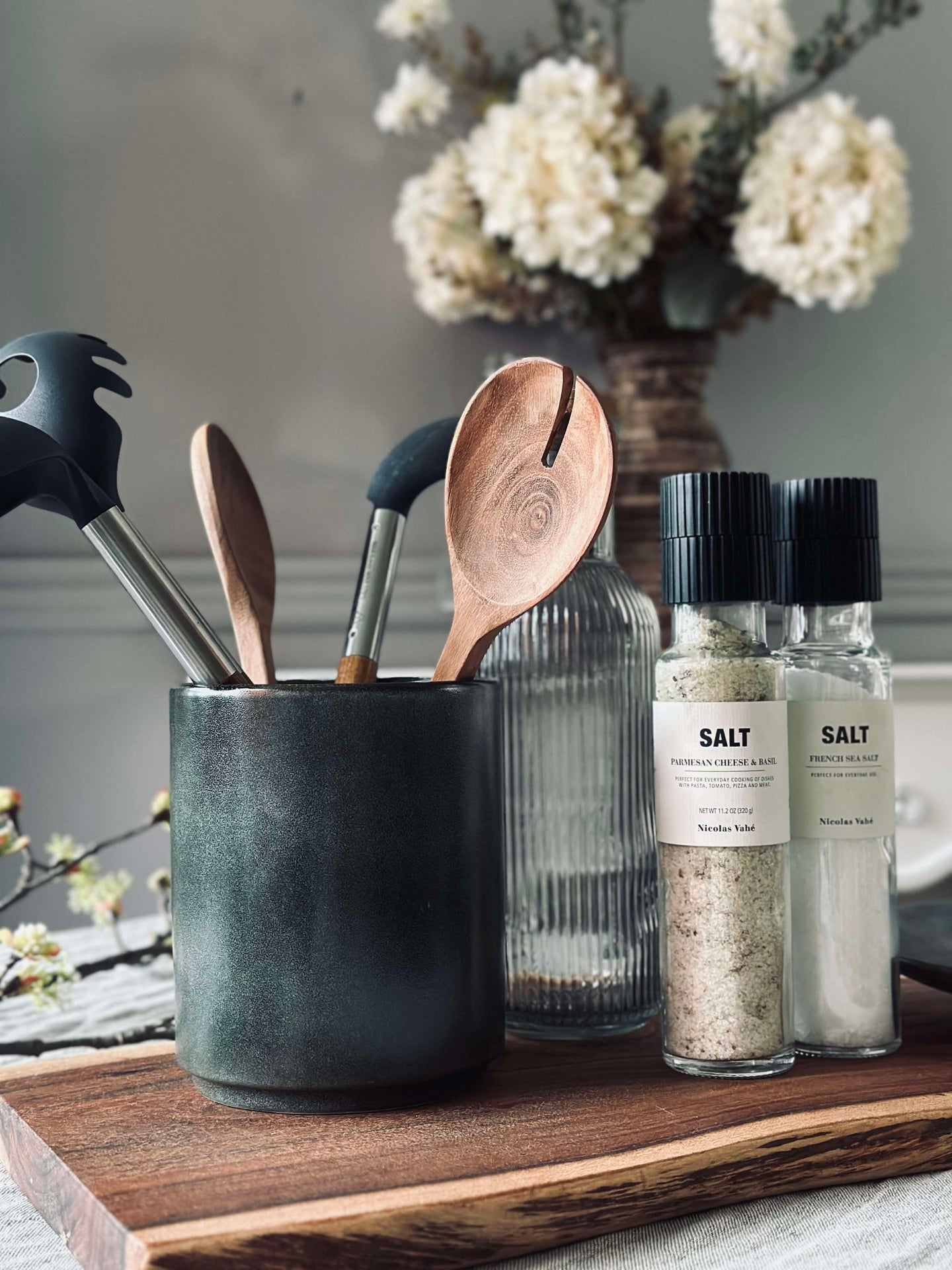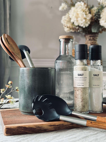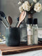 Har du tröttnat på oorganiserade köksredskap? Denna stilrena kruka i grå stengods ger en enkel lösning för att samla dina verktyg på ett ställe. Dess robusta material och subtila design kompletterar ditt kök, samtidigt som den är praktisk och hållbar.