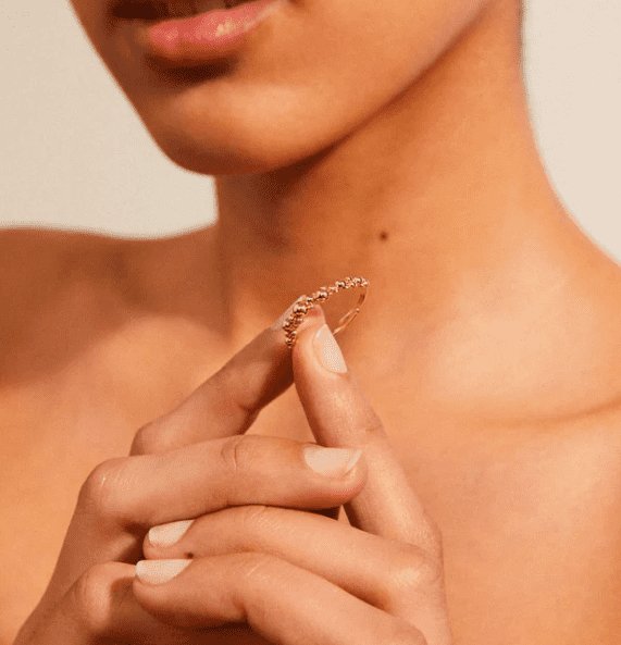 Denna unika guldring är belagd med guld och har sfäriska detaljer, vilket ger en distinkt och sofistikerad känsla. Dessa sfäriska detaljer ger ringen en tredimensionell känsla och skapar ett djup som gör att den sticker ut. Dessutom bidrar guldbeläggningen till en lyxig och trendig touch. Denna ring är inte bara ett tillägg till din smyckessamling, utan också ett uttryck för din personliga stil.