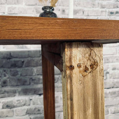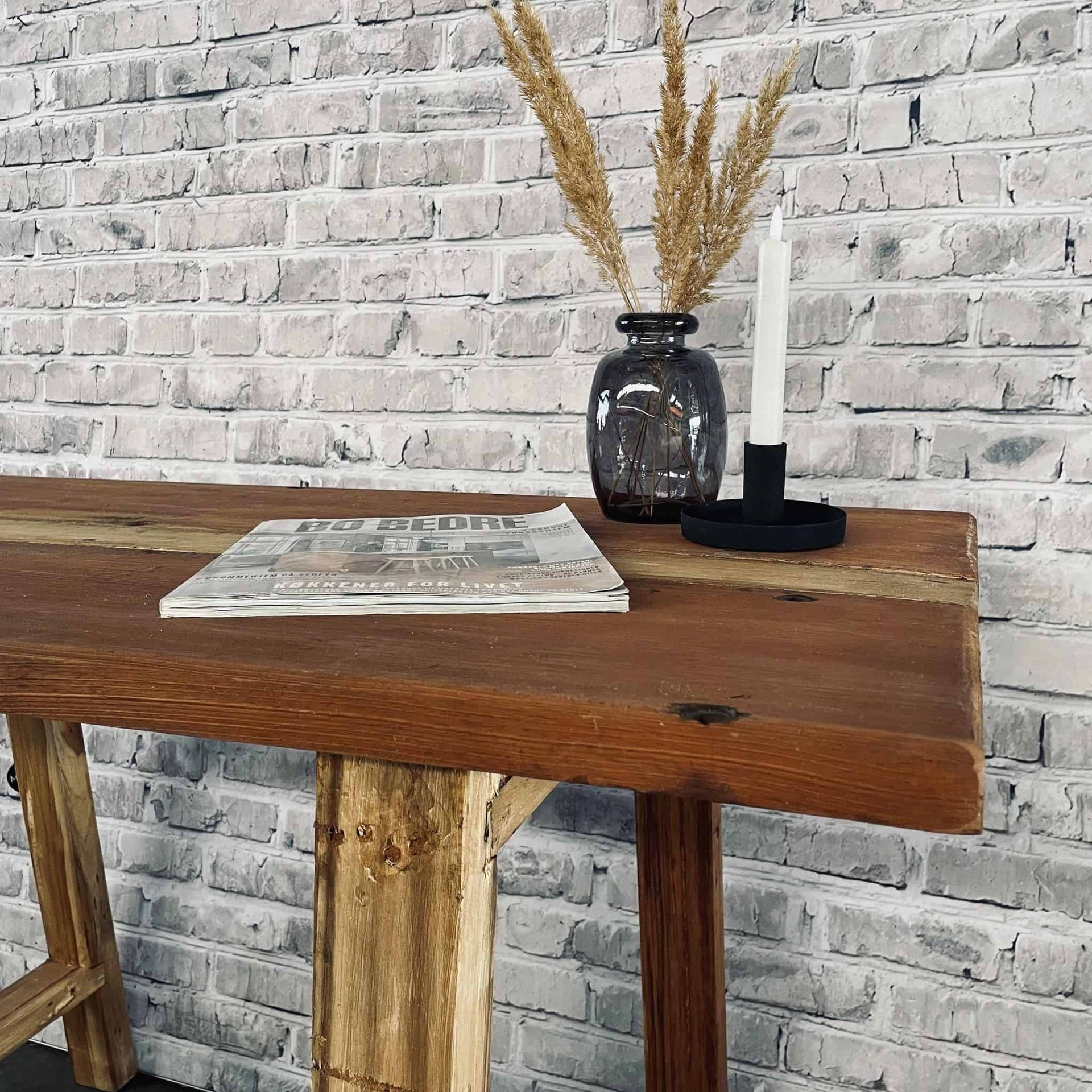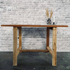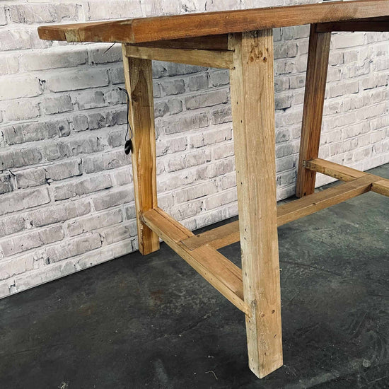 Detta rustika bord är tillverkat med robusta ben och en tjock bordsskiva. Det har en naturlig träfärg som visar upp synliga ådror och knutar, vilket bidrar till dess autentiska charm. Designen är enkel och kan tilltala dem som uppskattar hantverk och naturliga material i sin inredning.
