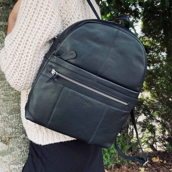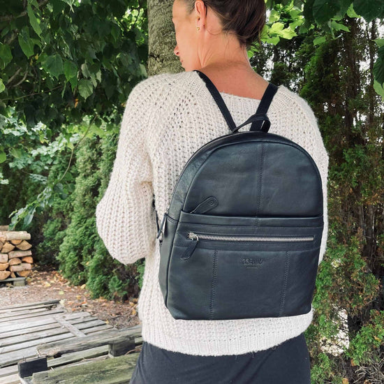 Denna svarta ryggsäck är tillverkad i högkvalitativt svart skinn, vilket ger den både en sofistikerad estetik och hållbarhet. Skinnet naturliga robusthet skyddar dina tillhörigheter effektivt, samtidigt som det erbjuder en lyxig känsla. Dessutom blir ryggsäcken bara vackrare med åren eftersom skinnet åldras med stil.