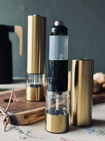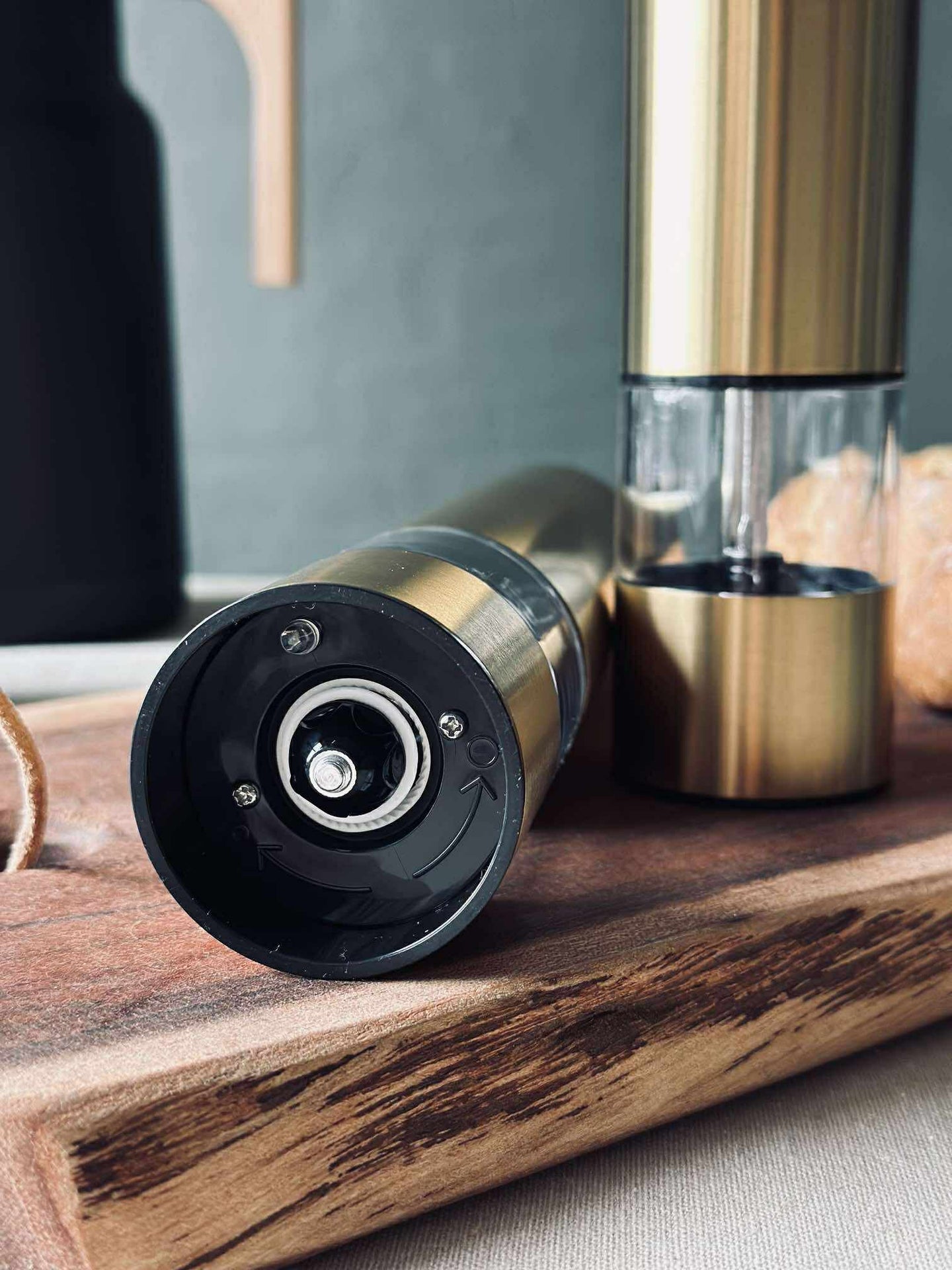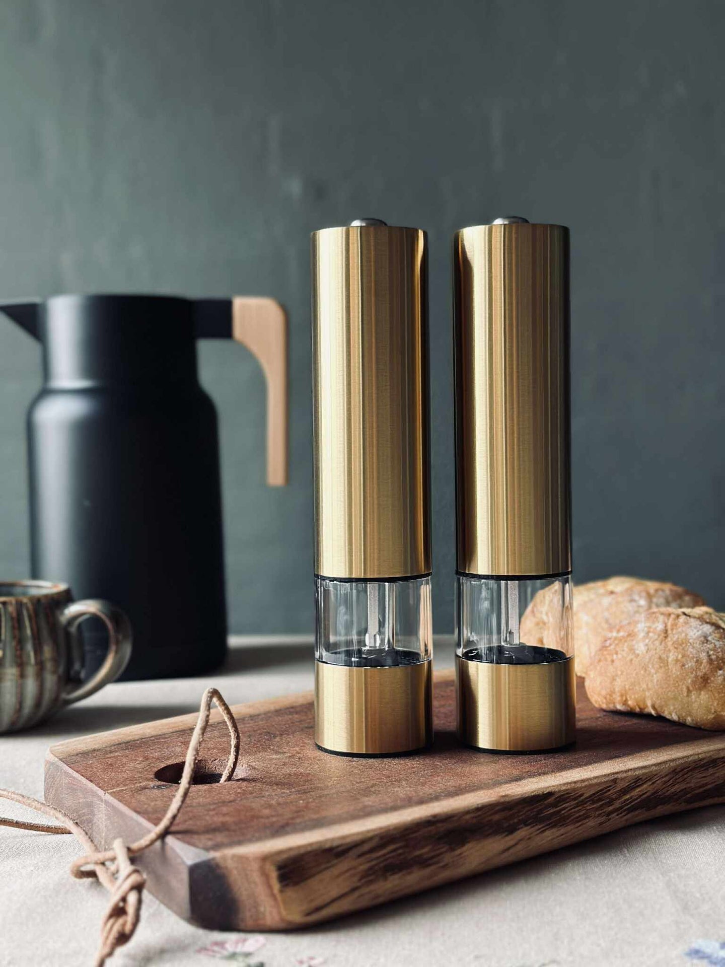 - Innehåller två elektriska kryddkvarnar för salt och peppar