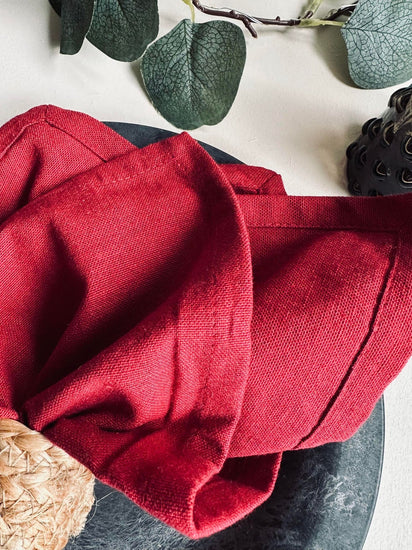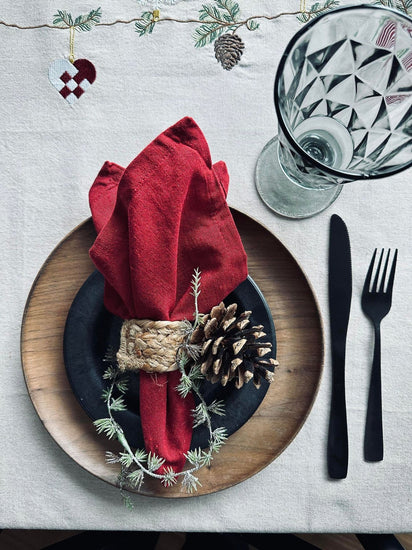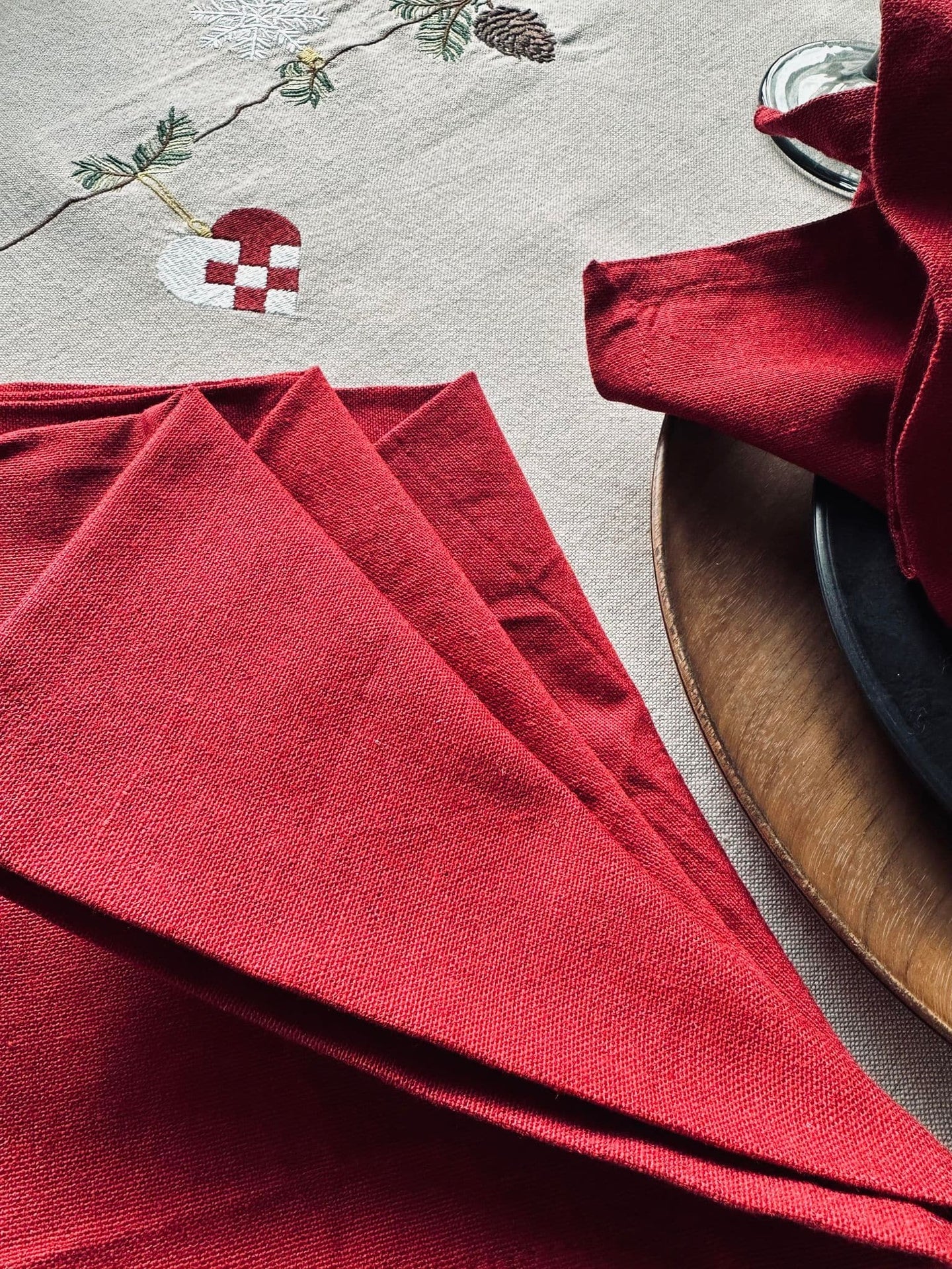 Våra julröda servetter är tillverkade av återvunnen bomull, vilket gör dem till ett hållbart val för din juldukning. Återvunnen bomull minskar avfallet och sparar på jordens resurser. Dessutom är dessa servetter inte bara miljövänliga, utan också mjuka och hållbara, vilket ger en lyxig känsla till din festliga bordsskiva.