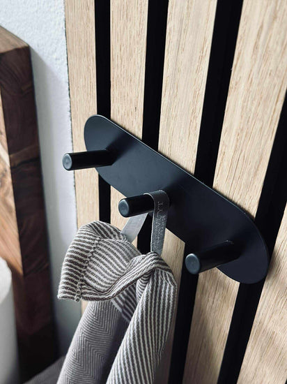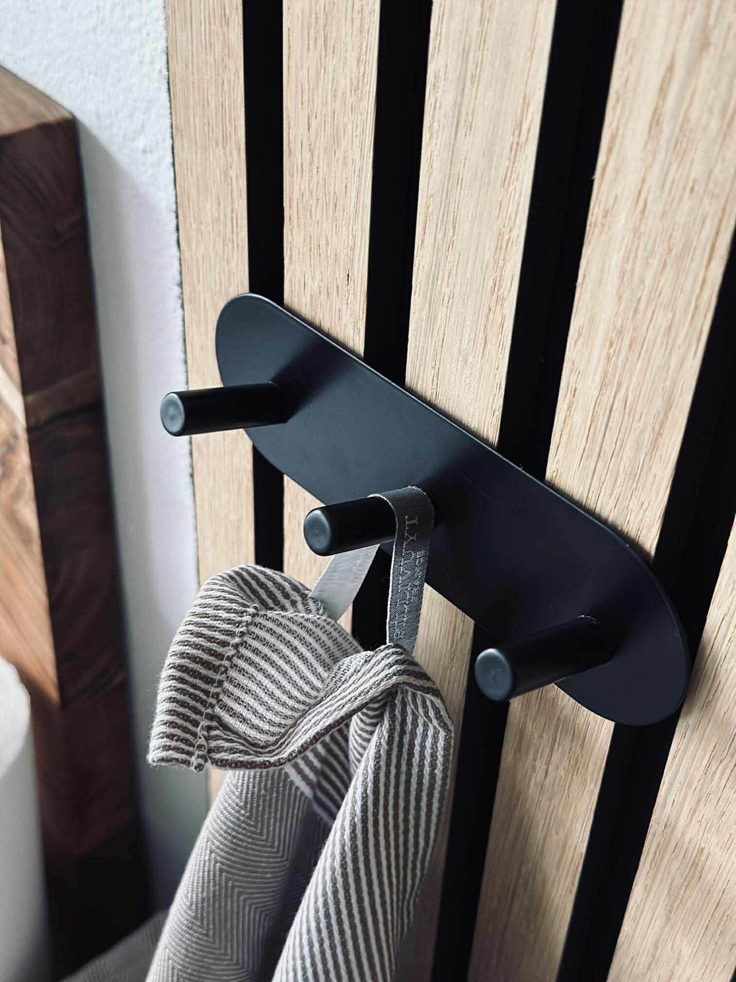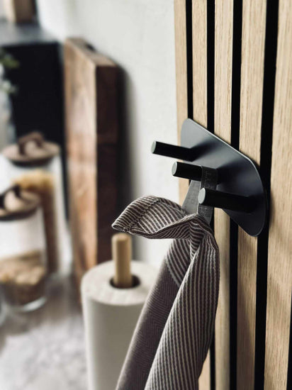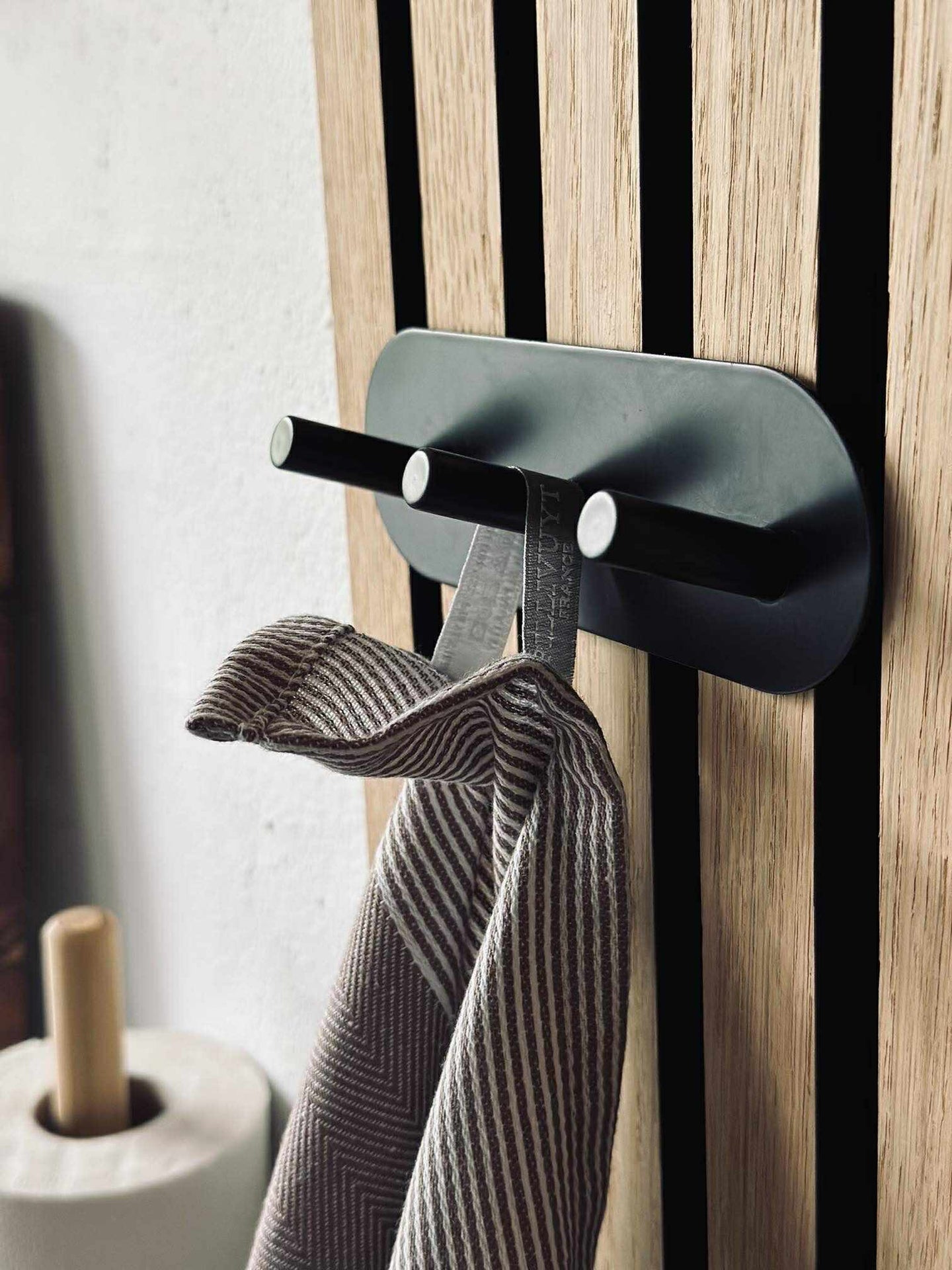 Knagen är tillverkad av svart metall, vilket ger den en stilren och modern estetik som passar in i de flesta badrumsmiljöer. Den svarta metallen är inte bara visuellt tilltalande utan också hållbar och motståndskraftig mot rost och slitage. Detta säkerställer att knagen behåller sitt utseende och sin funktionalitet över tid, vilket gör den till ett pålitligt val för daglig användning.