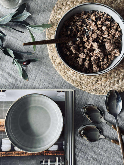 Stengods är ett hållbart material som bidrar till skålens robusta och långvariga kvalitet. Det motstår repor och är både värme- och kyltåligt, vilket gör det lämpligt för olika serveringsbehov. Dess naturliga och jordnära estetik ger en varm och inbjudande känsla till varje måltid. Med stengodsens täta struktur är skålen också lätt att rengöra, vilket underlättar vardagslivet.