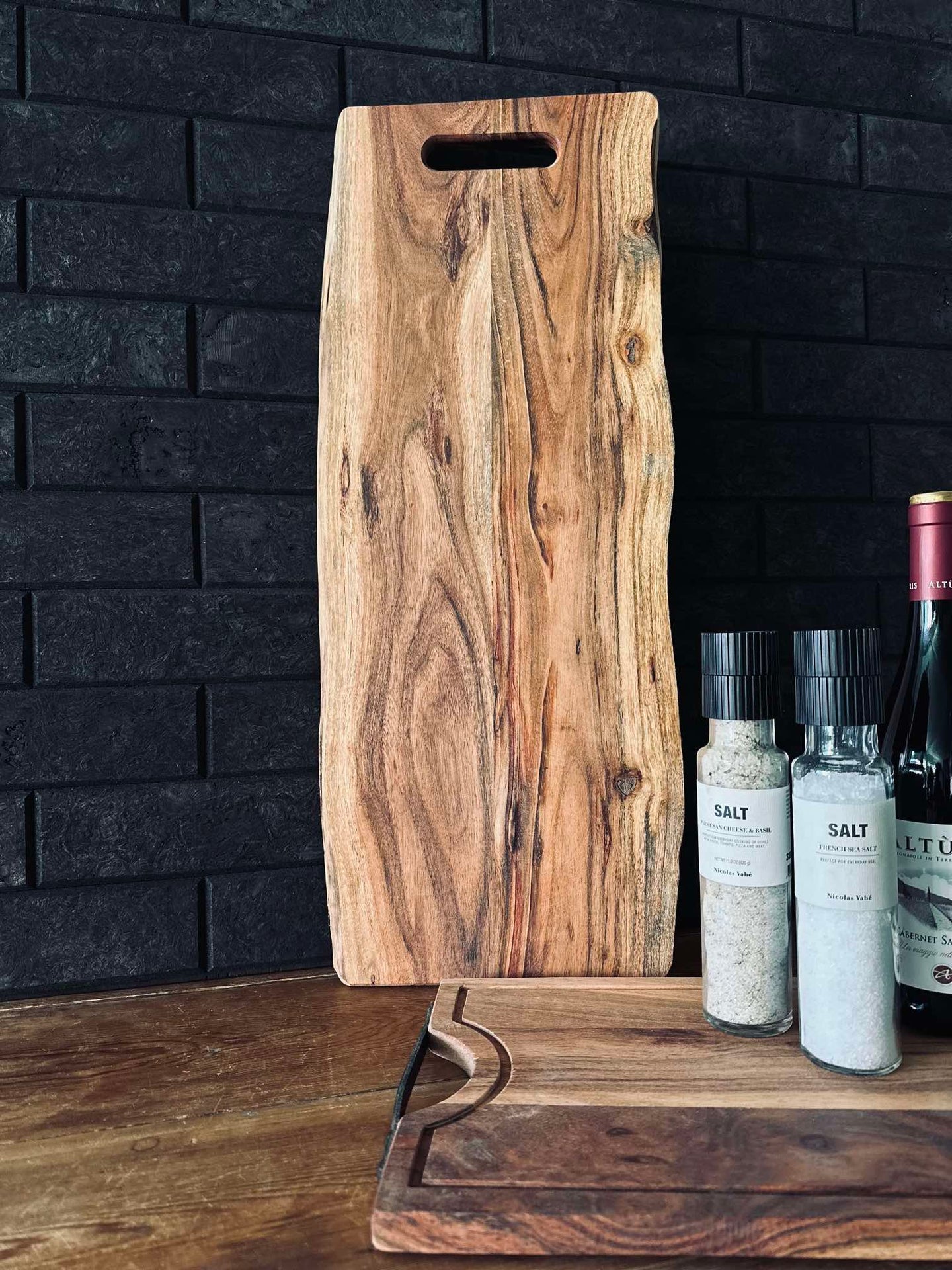 Skärbrädan är tillverkad av oljat akaciaträ, vilket ger den en naturlig motståndskraft mot fukt och bakterier. Detta material bidrar till en hållbar och robust yta som är skonsam mot knivarna och minskar risken för skador på deras egg. Dessutom ger akaciaträet skärbrädan en estetisk och varm ton som passar in i de flesta köksmiljöer.