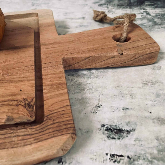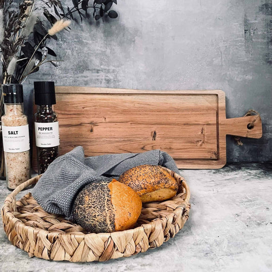 Är du trött på att de läckra tapasen försvinner i bordsspringorna? Med vår robusta skärbräda av akaciaträ kan du servera dina tapas på ett enkelt och stilfullt sätt, samtidigt som den charmiga läderupphängningen ger ett elegant inslag i ditt kök.