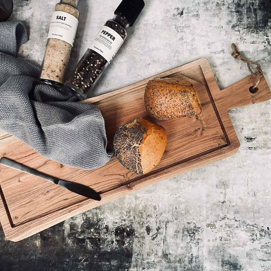 - Stor skärbräda tillverkad i akaciaträ med saftspår