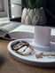 Sminkspegeln är tillverkad av plast, vilket gör den lätt och enkel att hantera, särskilt i badrum där fukt kan vara ett problem. Plastmaterialet bidrar till att spegeln är mer motståndskraftig mot vatten och rost, vilket förlänger dess livslängd. Den lätta vikten gör den också enkel att flytta runt och anpassa efter behov.