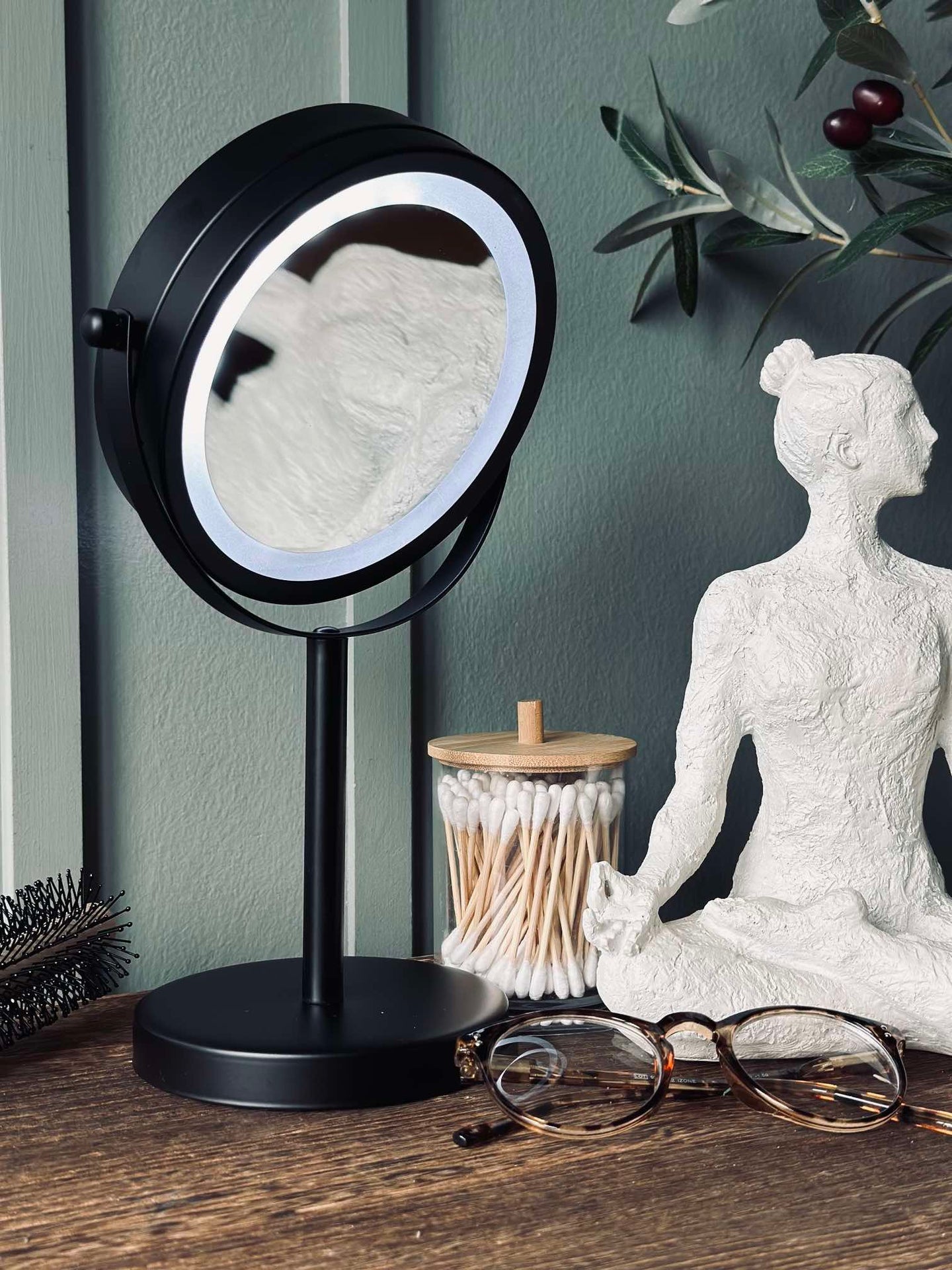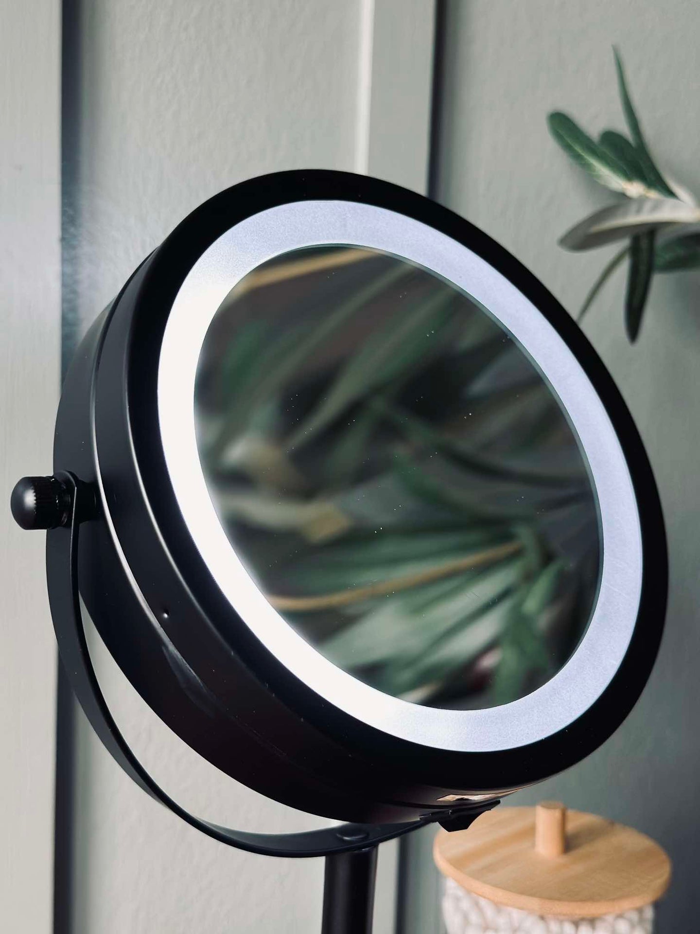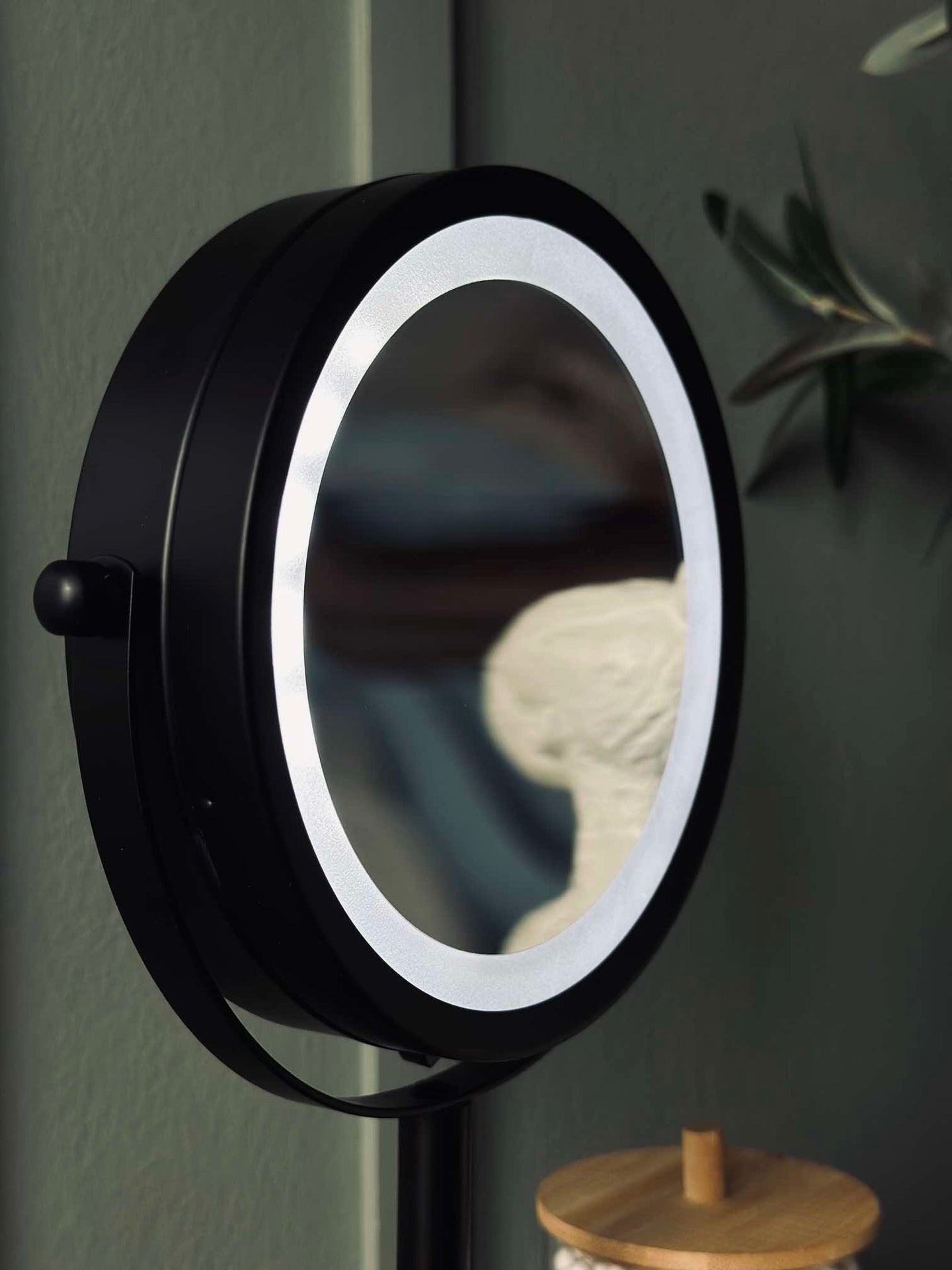 Denna sminkspegel har en svart metallram som ger en modern och stilren känsla till ditt sminkbord. Den robusta konstruktionen säkerställer hållbarhet och stabilitet, vilket gör att spegeln står stadigt när du använder den. Den svarta färgen är dessutom lätt att matcha med andra inredningsdetaljer, vilket gör den till ett praktiskt och estetiskt tilltalande val för ditt hem.
