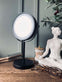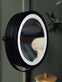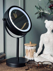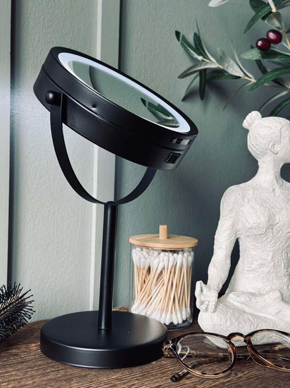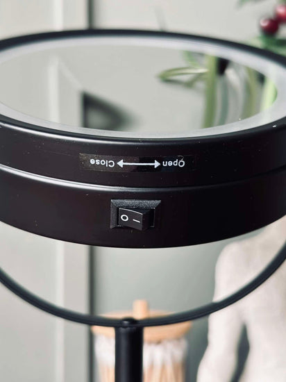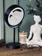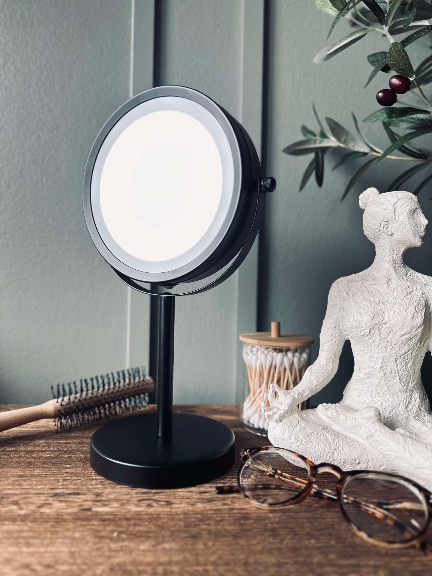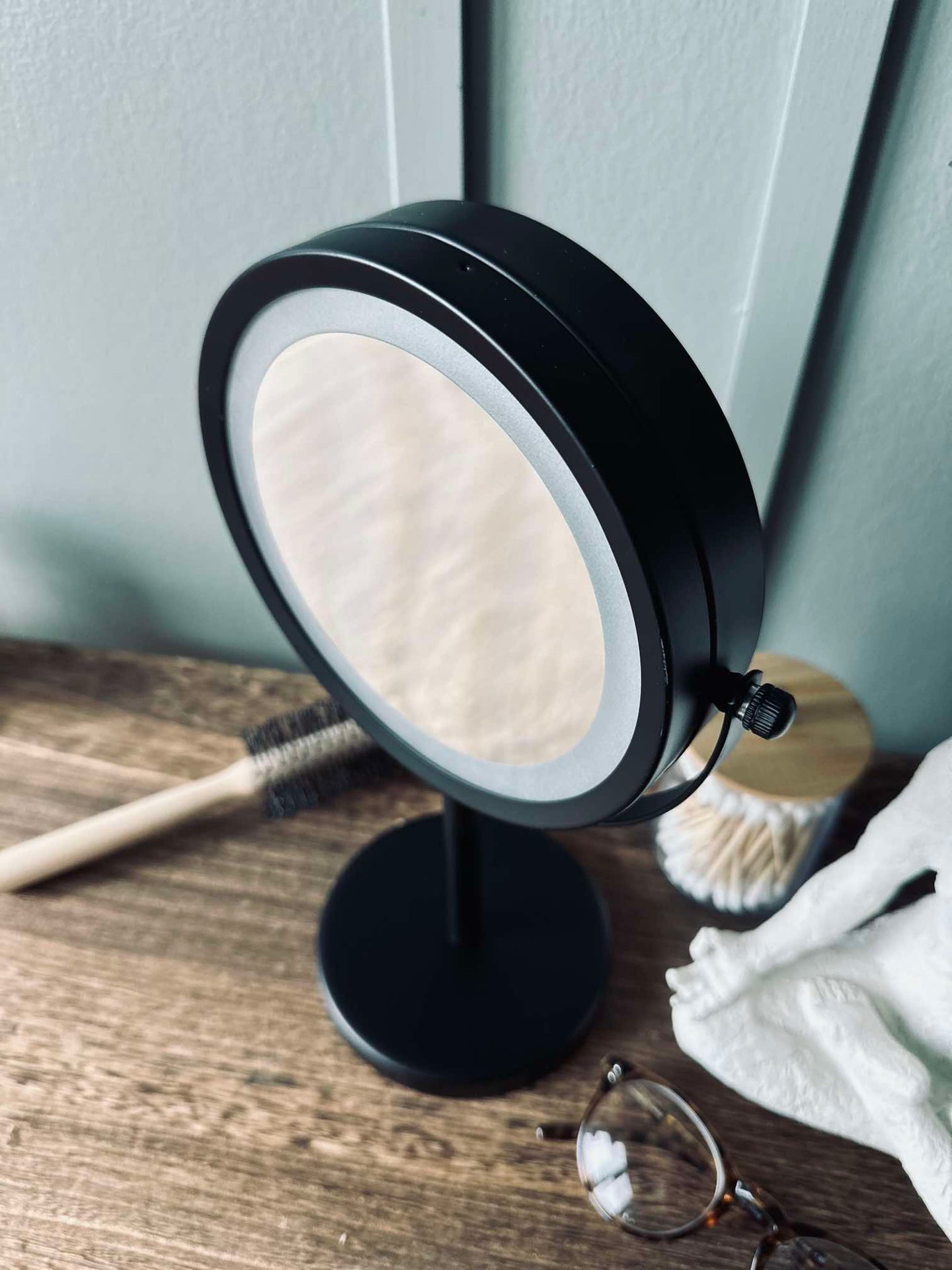 Denna sminkspegel har en svart metallram som ger en modern och stilren känsla till ditt sminkbord. Den robusta konstruktionen säkerställer hållbarhet och stabilitet, vilket gör att spegeln står stadigt när du använder den. Den svarta färgen är dessutom lätt att matcha med andra inredningsdetaljer, vilket gör den till ett praktiskt och estetiskt tilltalande val för ditt hem.