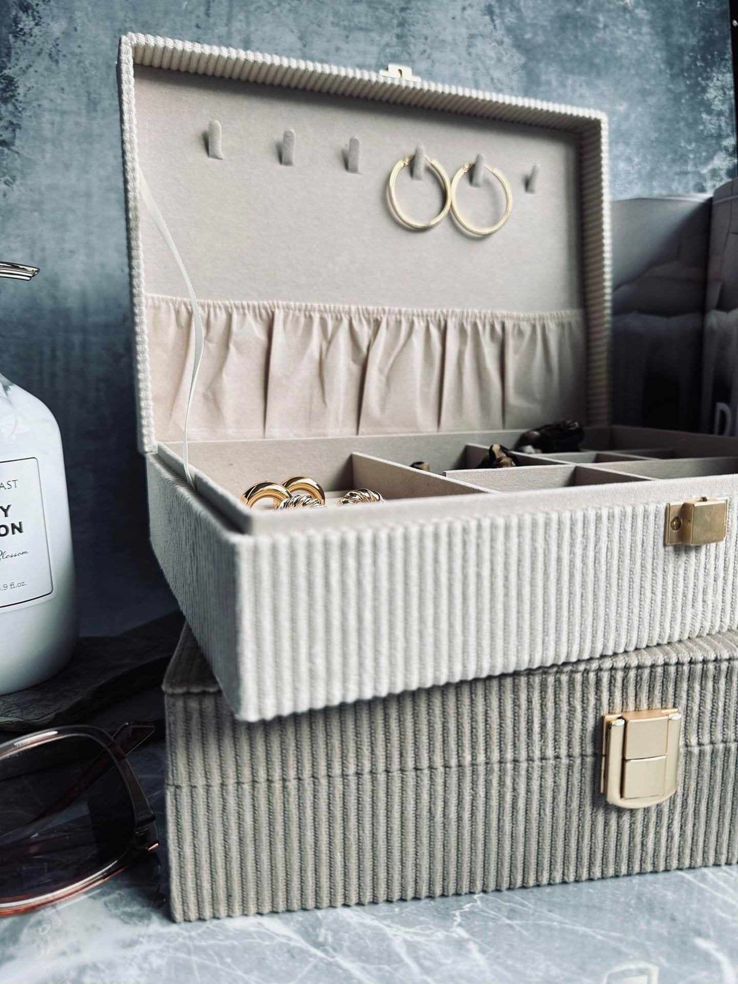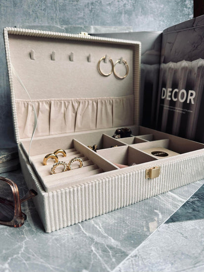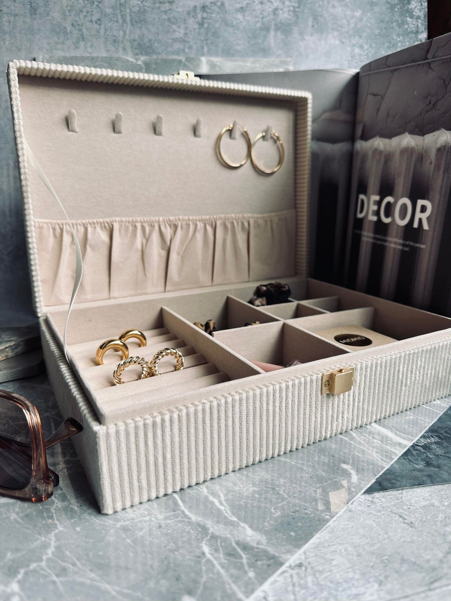 Har du någonsin känt att dina smycken är oorganiserade och svåra att hitta? Låt Norma ljus beige smyckeskrin bidra till en mer strukturerad och snygg förvaring. Enkel design som passar alla heminredningsstilar.