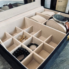 Velourtyget som används i detta smyckeskrin är både elegant och hållbart. Det ger en lyxig känsla till produkten och håller länge. Dess mjuka yta skyddar dina smycken mot repor och skador.