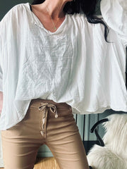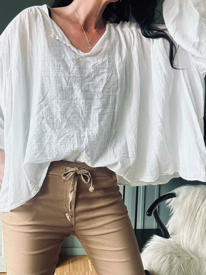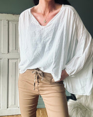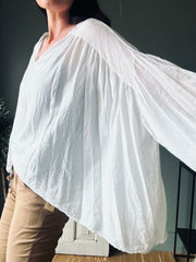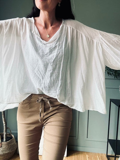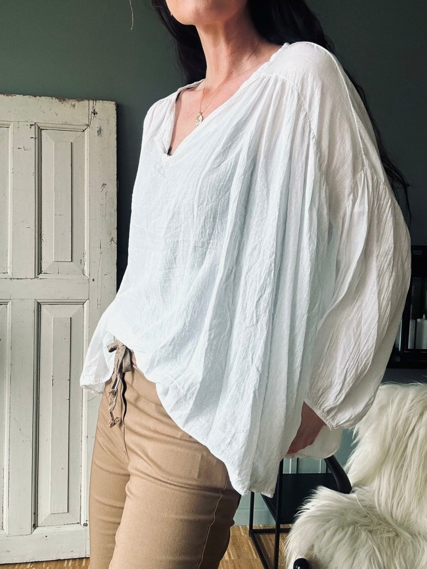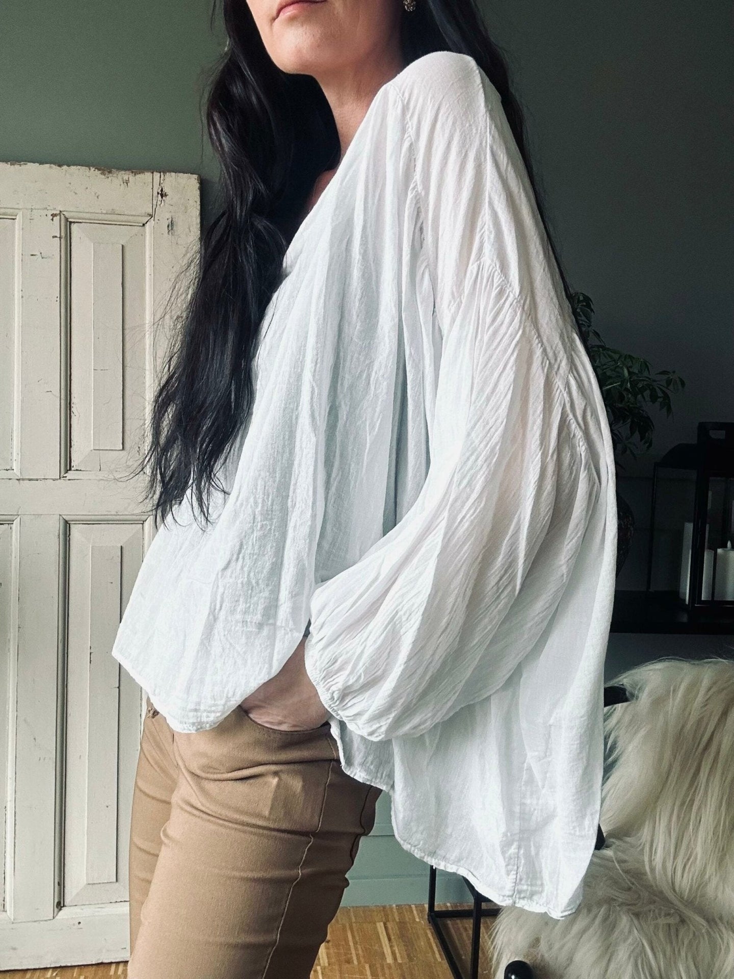Vi presenterar vår sommarblus i vitt med ballongärmar. Denna blus har en lätt krölad textur som ger den en unik touch. Dess avslappnade snitt och luftiga design gör den perfekt för sommarbruk. De enkla linjerna framhäver den voluminösa ärmeffekten.